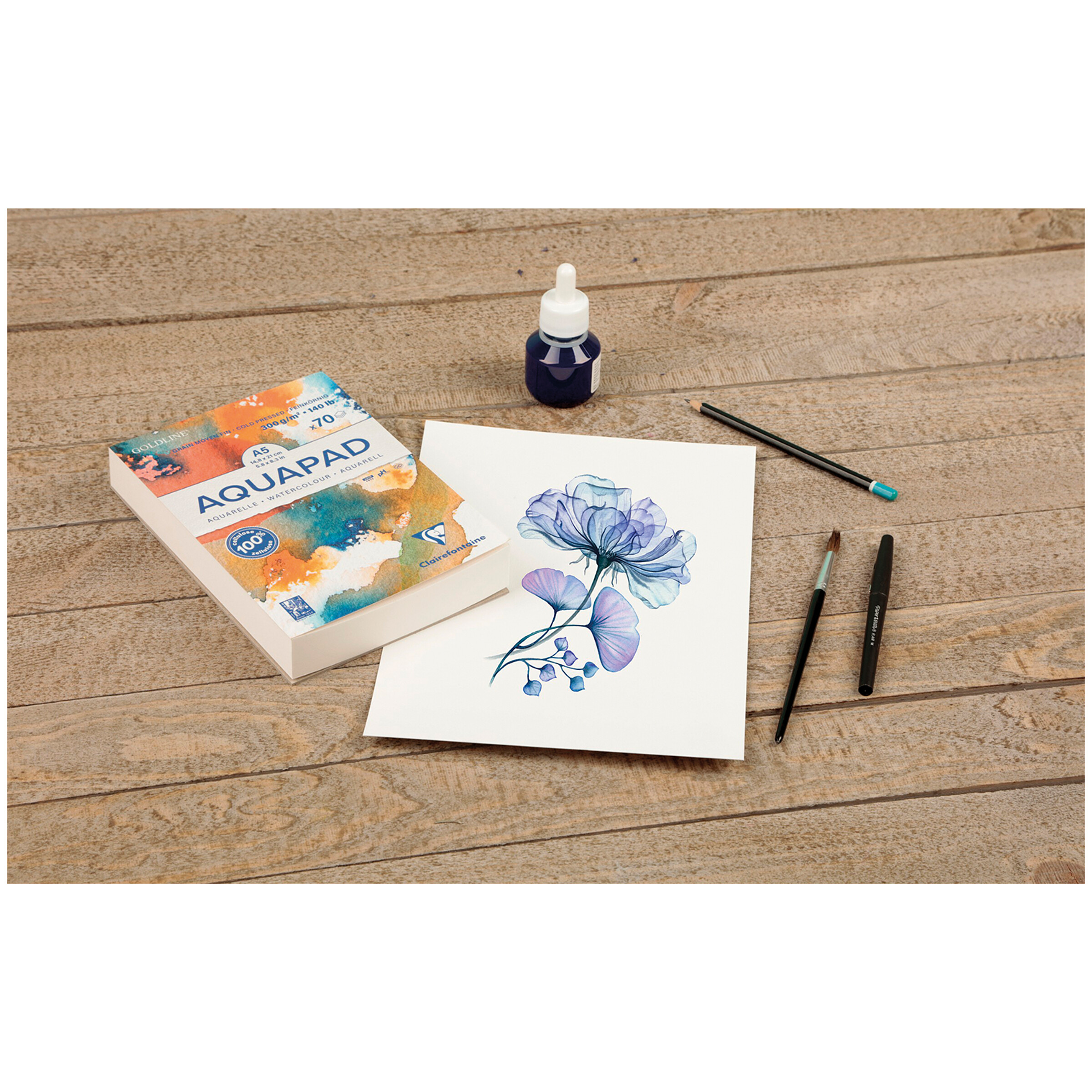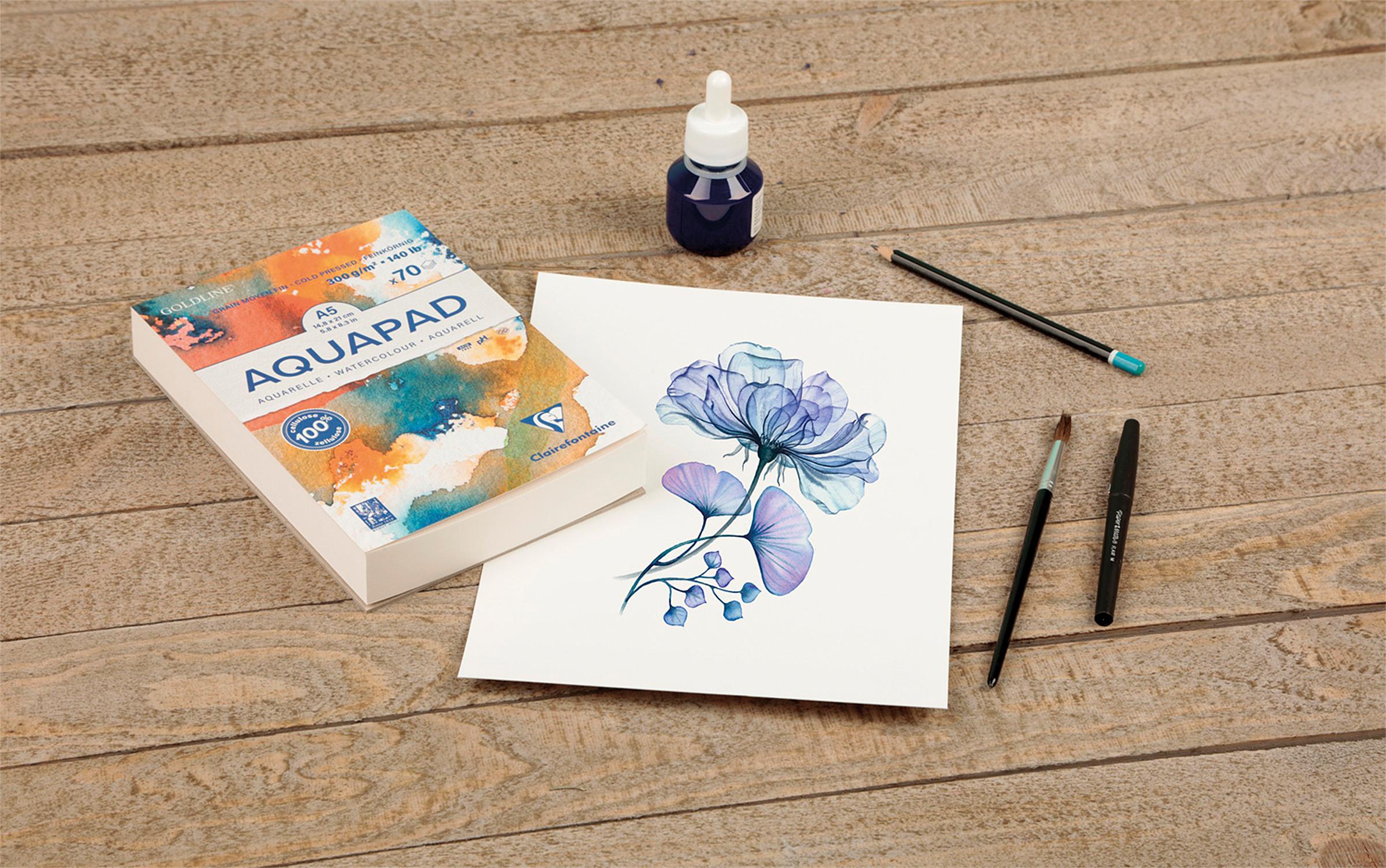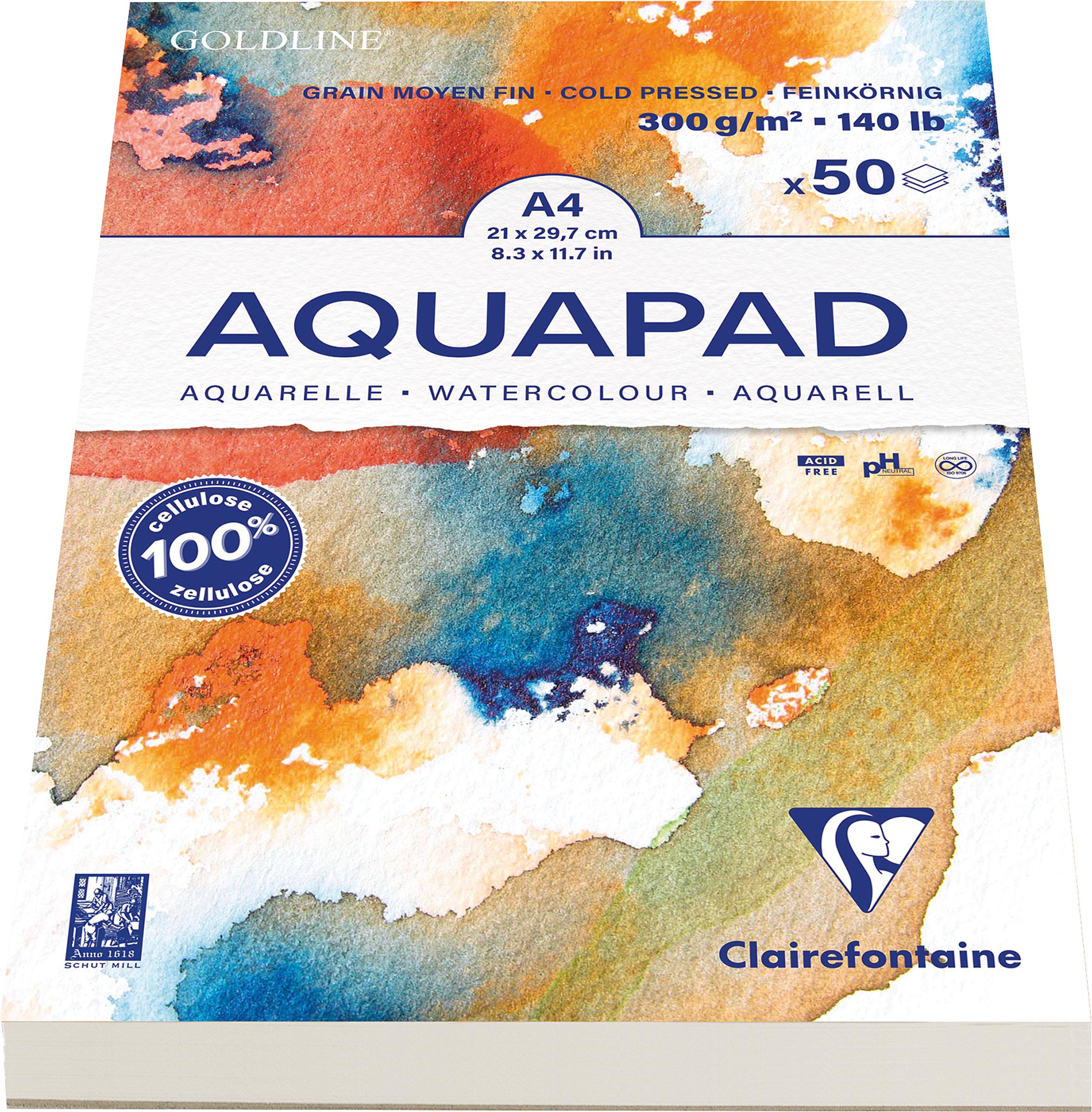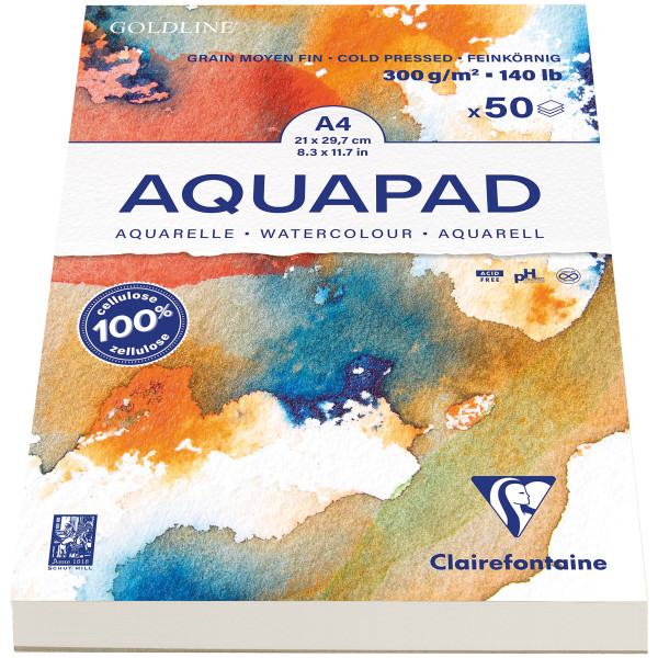 Natürlich weißes, geleimtes 300 g/m²-Aquarellpapier in Studienqualität mit einer feinen, mittleren Körnung, die auf einer Seite des Papiers ausgeprägter ist. Goldline Aquapapier besteht aus reiner Zellulose, ist säurefrei, pH-neutral, alterungsbeständig und weist eine sehr gute Absorptionskraft auf.
