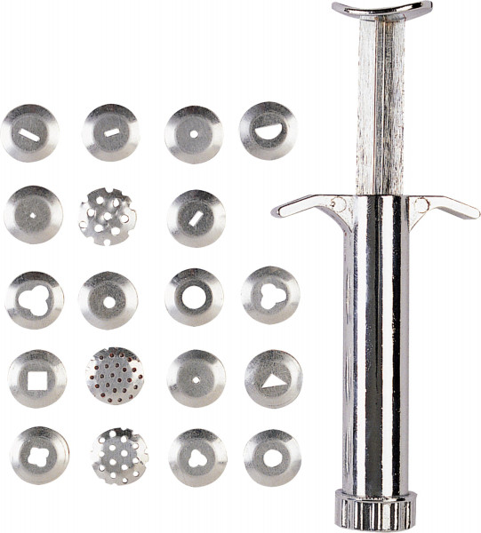 Aus Zinkguss mit 19 Schablonen. Zylinderförmige Handtonpresse zum Herstellen von Profilsträngen, d.h. von Formen und Verzierungen aus Ton entsprechend der aufgeschraubten Schablone. Handtonpresse Länge 10-17 cm, Schablonen ca. Ø 1,5 cm.