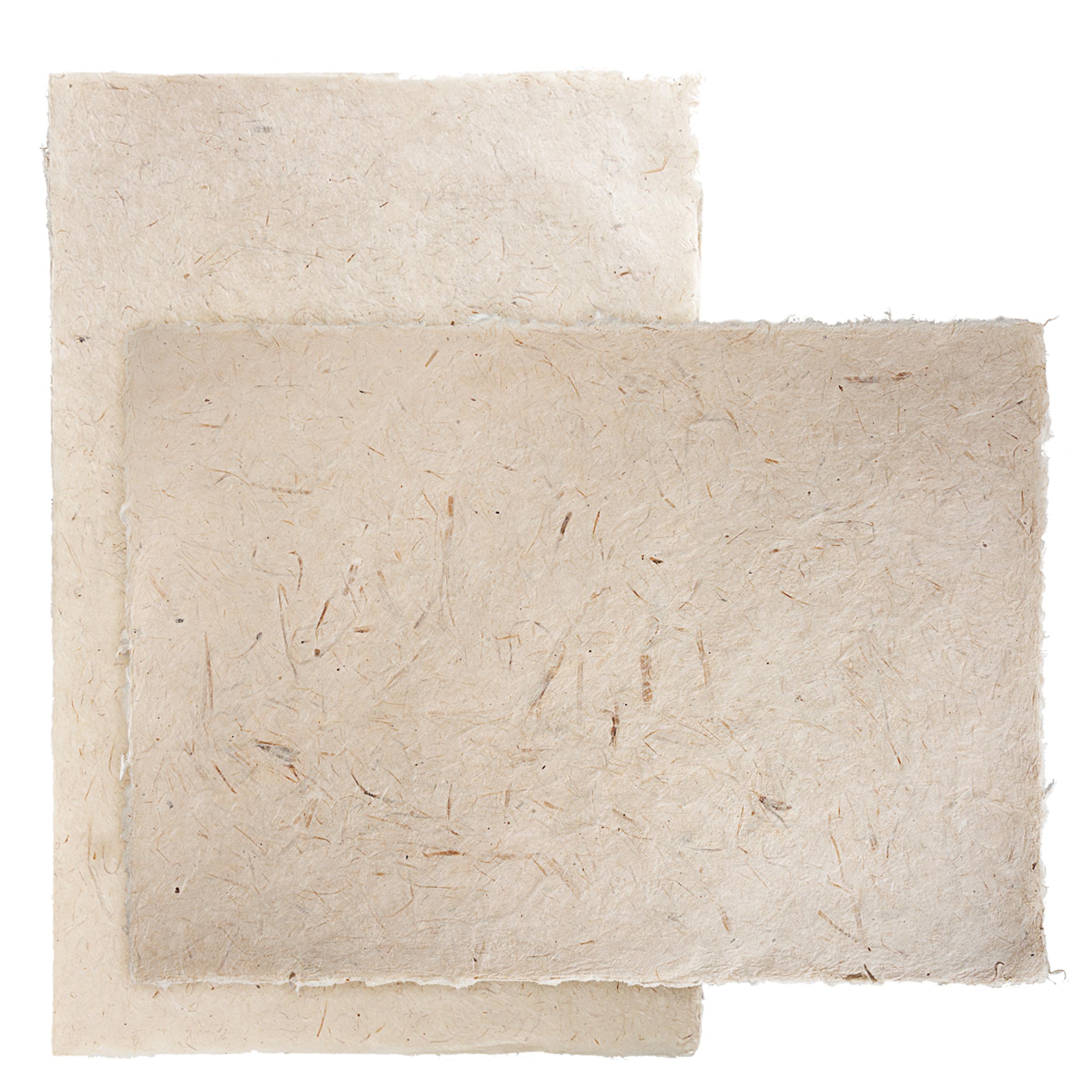 Aus 70 % Hanffasern und 30 % Lokta (Seidelbast). Säurefrei. Einzeln handgeschöpft. Der für die Kahari-Papiere verwendete Hanf (Canabis sativa) wächst in bis zu 4.000 Metern Höhe im Himalayagebirge. Einheimische Bauern bauen den Hanf in steilen Gebirgsgegenden als Schutz rings um ihre Getreidefelder an. Die starke Wurzel der Pflanze verhindert die Erosion des Unterbodens. Hanf ist eine der am schnellsten wachsenden, jährlich wiederkehrenden Pflanzen mit sehr reichhaltiger Faserernte. Im Vergleich zur Baumwolle hat die Hanffaser eine 9-fache Reißstärke (Zugkraft). Zudem ist die Pflanze äußerst umweltfreundlich, weil sie weder mit Pestiziden noch mit Dünger behandelt werden muss und dem Boden sogar Nährstoffe zuführt. Die geernteten Fasern werden geschnitten, gewaschen, von Hand zu Brei geklopft und mit der Seidelbast-Rohmasse gemischt. Der Schöpfvorgang ist dann genauso wie bei den bereits vorgestellten anderen Kahari-Papieren.