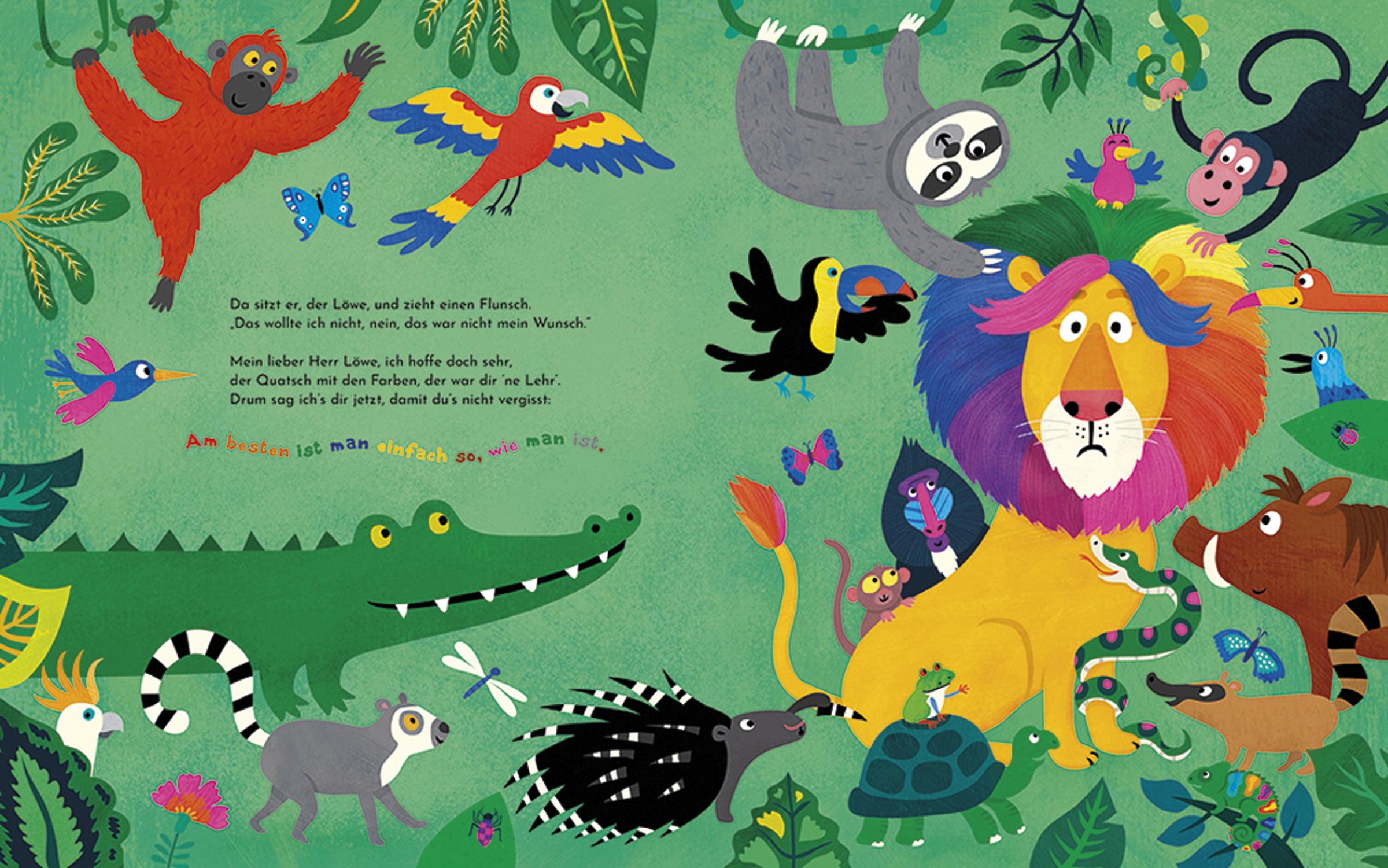 Herr Löwe ist unzufrieden. Sehr sogar. Denn neben all den farbenfrohen Tieren des Dschungels fühlt er sich mit seinem gelb-braunen Fell so gar nicht besonders. Gelb und Braun sind einfach nicht die richtigen Farben für den König der...