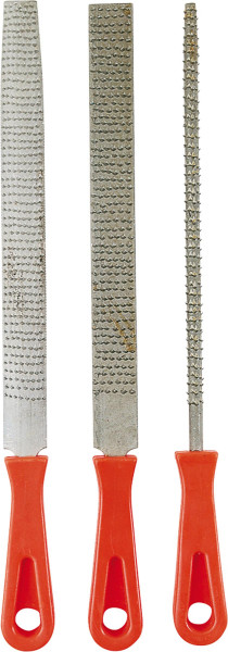 Das Set beinhaltet drei große Riffelraspeln, flach, halbrund und rund. Extra scharfe und tief gehauene Zähne für Holz, Horn und Stein. Außerdem sehr gut für die Bearbeitung von Speckstein-Rohlingen geeignet. Mit Kunststoffgriff. Länge 20 cm.