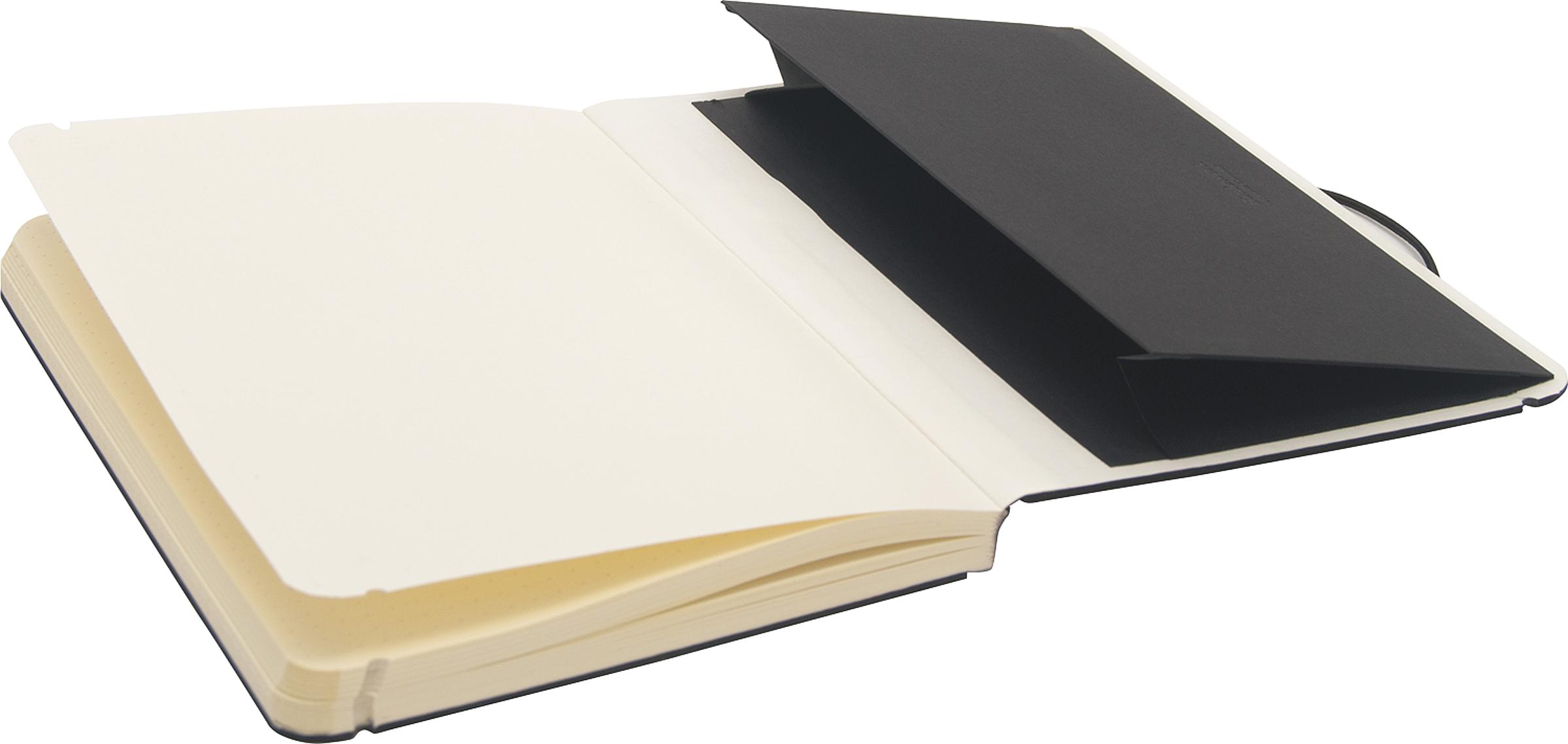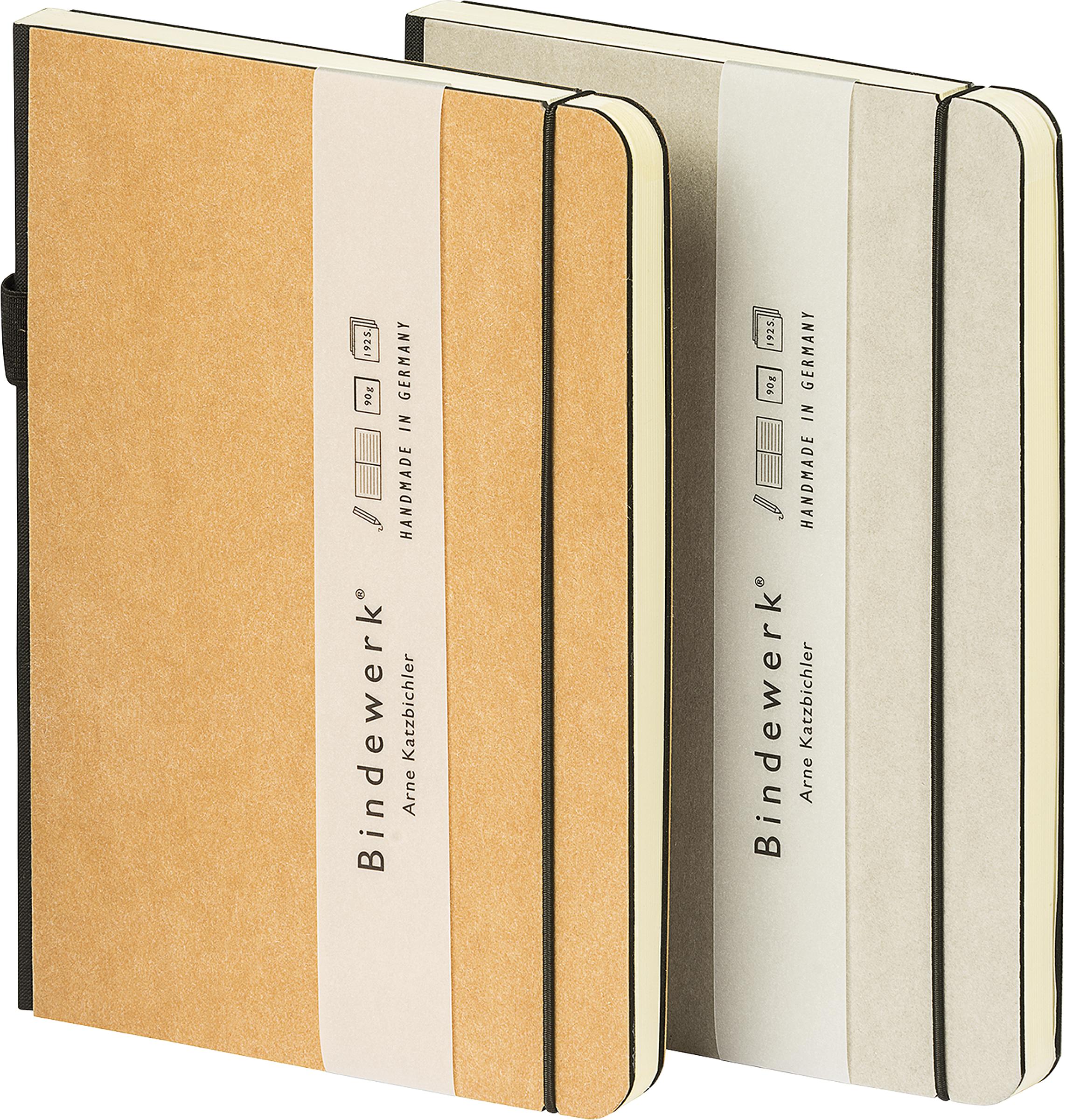 Buchserie mit schwarzem Leinenrücken und Sandwich-Einbänden, zusammengesetzt aus unempfindlicher grauer oder brauner Zellpappe und fester Schwarzpappe für besonders hohe Stabilität. Jedes Buch wird aus feinem, chamoisfarbenem 90 g/m²-Papier fadengeheftet und ist blanko erhältlich. Die Ecken dieser Notiz- bzw. Skizzenbücher sind abgerundet, ein schwarzes Rundgummi, das sich besonders gut greifen lässt, dient zum Verschließen, sodass auch lose eingelegte Blätter nicht verloren gehen. Außerdem bietet eine in den hinteren Deckel eingearbeitete Einstecktasche Platz für Visitenkarten, Notizzettel etc., inkl. Stiftlasche. Handgefertigt in einer bayerischen Manufaktur.