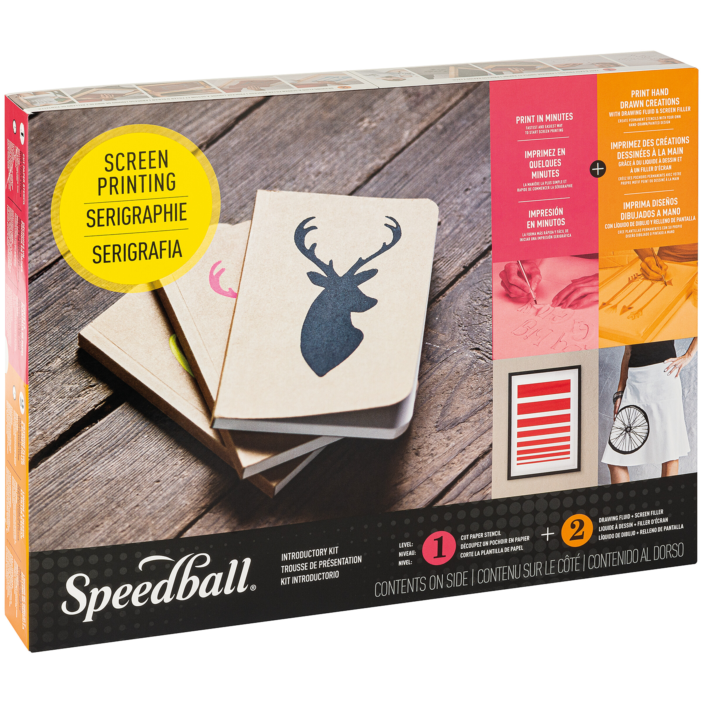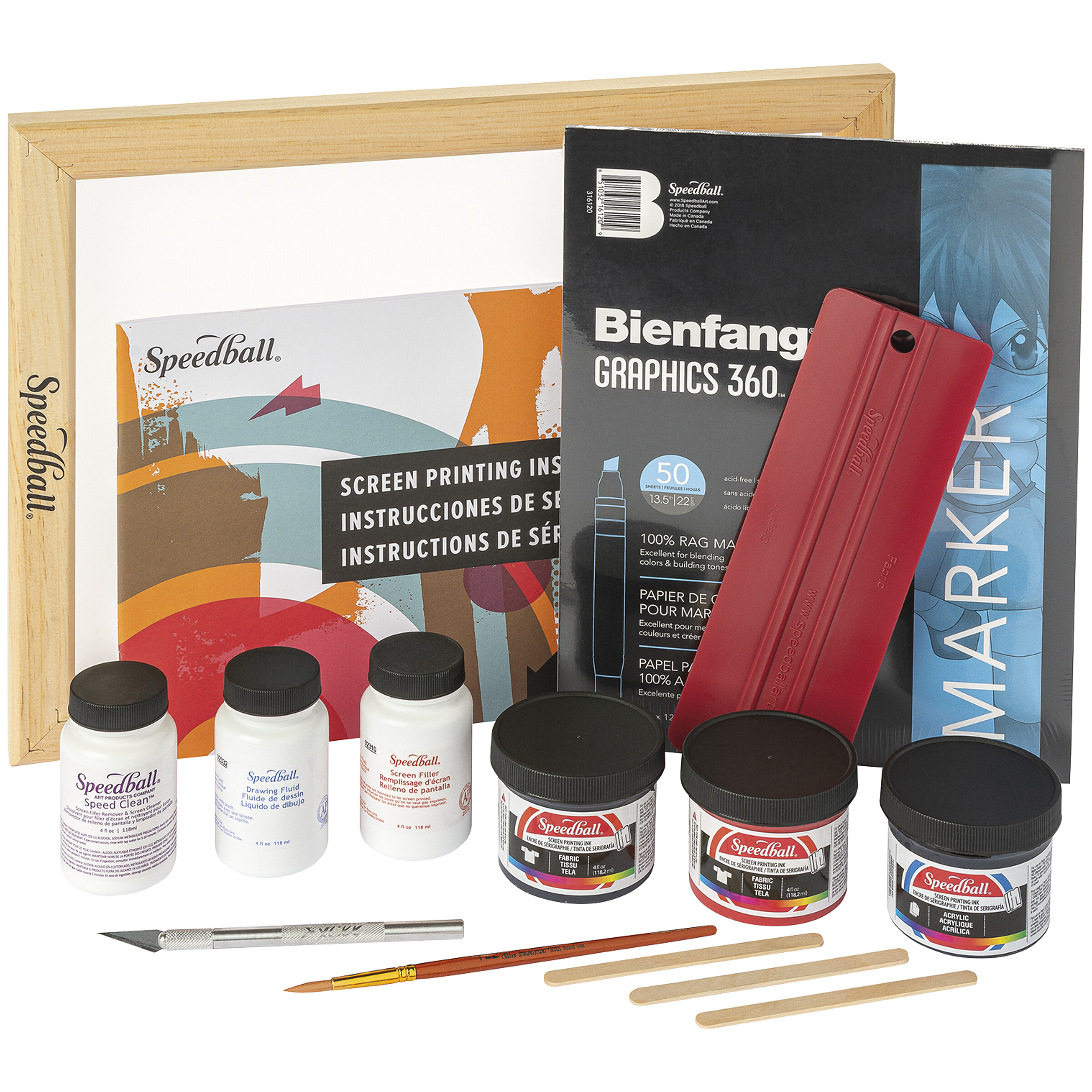 Im Set enthalten sind: 1 Holz-Siebdruckrahmen (25,4 x 35,6 cm), 1 Red Baron™ Rakel, 2x 118,2 ml Fabric Screen Printing Ink (je 1x Black & Red), 1x 118,2 ml Acrylic Screen Printing Ink (Black), 1x 118 ml Drawing Fluid, 1x 118 ml Screen Filler, 1x 118 ml Speed Clean, 1 Bienfang® Graphics 360™ Papierblock, 1 Rundpinsel, 3 Farbmischhölzer, 1 Universalmesser und eine Siebdruck-Anleitung.