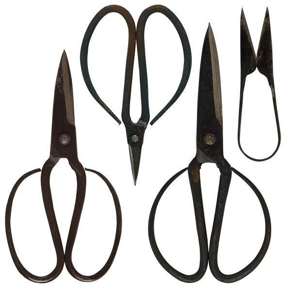 Das japanische Scherensortiment bietet vielseitigen Nutzen in solider Ausführung: Die handgeschmiedeten, genieteten Eisenscheren liegen gut in der Hand und sind in drei Blattlängen erhältlich – robust und universell einsetzbar in Atelier und Werkstatt. Eine Besonderheit mit langer Tradition stellt die japanische Nigiri dar: Seit Ende des 17. Jahrhunderts war die Bügelschere in Europa die häufigste Scherenform. Die Bügelschere ist von Hand aus einem Stück geschmiedet und nutzt Materialspannung und Federwirkung für ihren leichtgängigen Öffnungsmechanismus. Sie eignet sich durch ihren gut kontrollierbaren, präzisen Schnitt besonders für filigrane Arbeiten – zum kunstvollen Papierschnitt, aber auch zum Auftrennen von Nähten oder zum Schnitt feiner Kräuter.