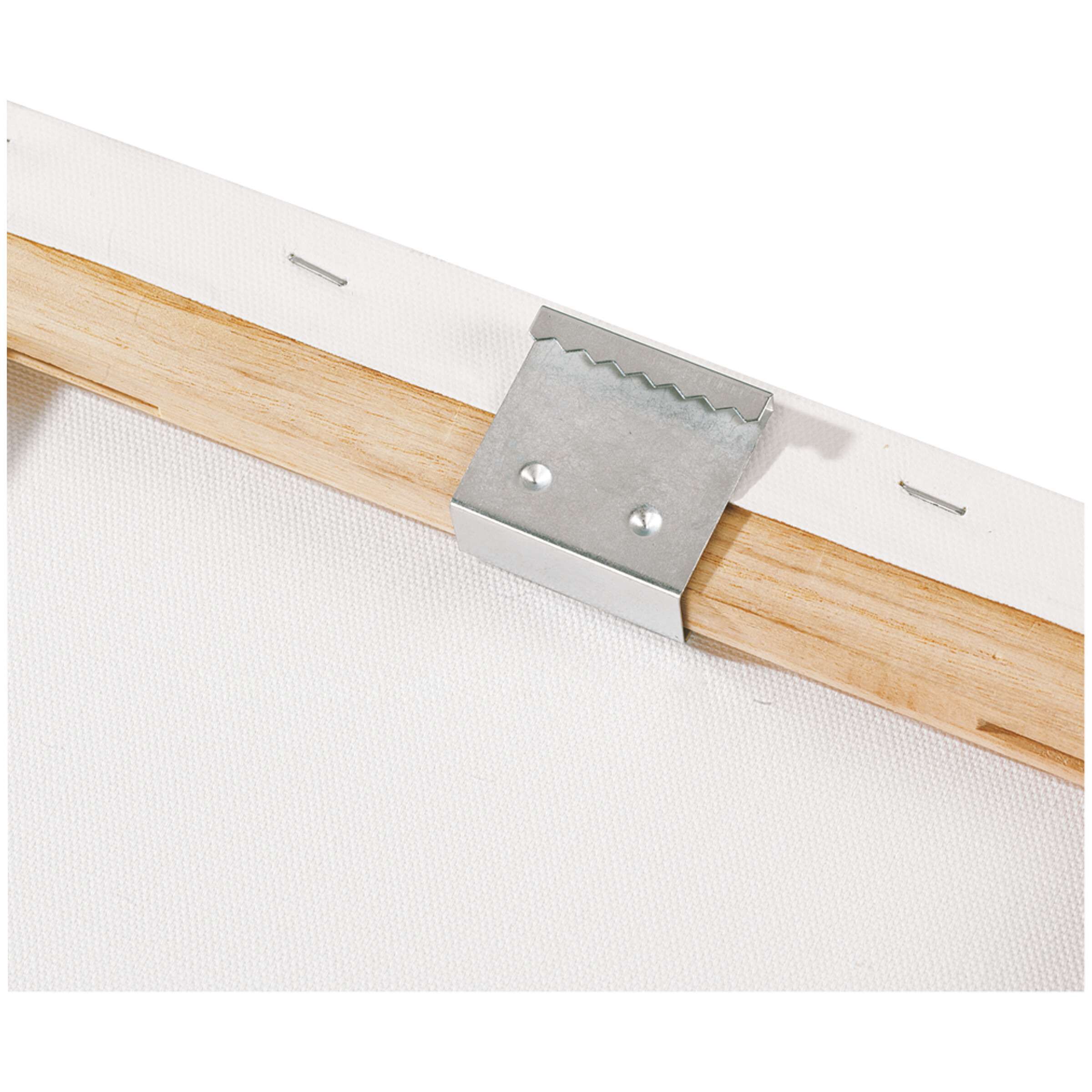 Zum sicheren und beschädigungsfreien Aufhängen bespannter Keilrahmen. Der Keilrahmenaufhänger lässt sich leicht zwischen Leinwand und Keilrahmenleiste einhängen.