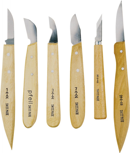 Das Pfeil Kerbschnittmesser-Sortiment umfasst neben Schnitzmessern in verschiedenen Längen, Rosenmesser, Konturenmesser, Tarsomesser sowie Detailschnitzmesser, Fuchsmesser und Schnitzhaken.