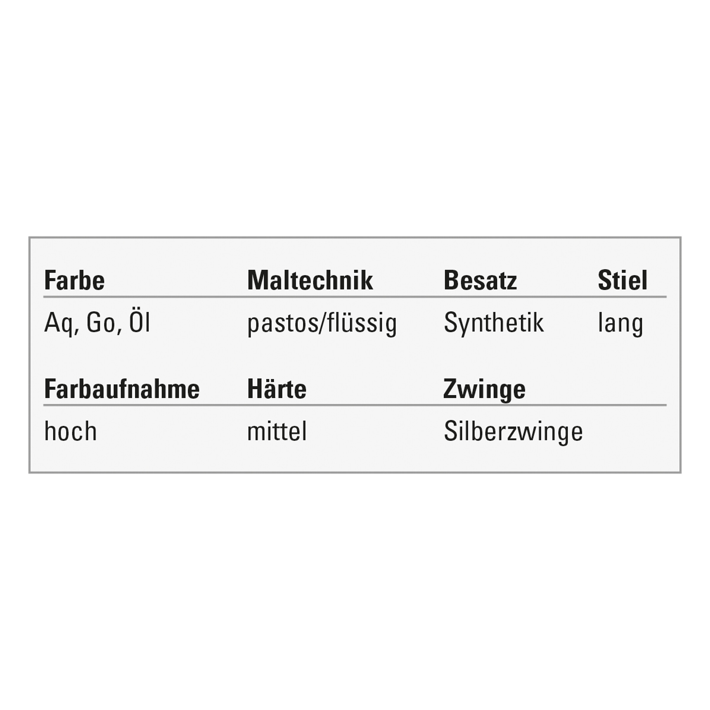 Hochwertiger Ölmalpinsel mit Kolintik-Synthetikhaar. Der Besatz ist in seinen Eigenschaften mit echtem Kolinskyhaar vergleichbar und zeichnet sich durch besondere Elastizität, eine außergewöhnlich hohe Farbaufnahmekapazität sowie eine fein ausgeformte Spitze aus. Ausführung mit nahtlosen, vernickelten Messingzwingen. Langer Stiel aus FSC-zertifiziertem Birkenholz, mit einer besonders umweltfreundlichen Beize überzogen. Made in Germany.