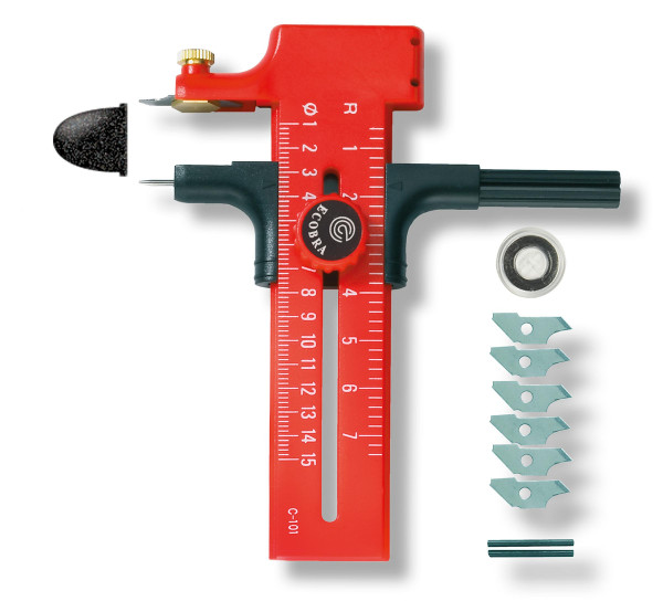 Kreis-Cutter inkl. 6 Ersatzklingen und 2 Bleiminen im Gehäuse, mit Kunststoff-Schutzscheibe zum Schutz vor Zerkratzen sowie mit Schutzkappe. Ist geeignet zum Schneiden von Papier, Karton, Stoffen und ähnlichen Materialien. Skalierung von 10–150 mm.