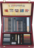 Der Holzkasten enthält die 24 Farben Zitronengelb, Kadmiumgelb hell, Chromgelb dunkel, Chromorangeton, Kadmiumrot hell, Dunkelrot, Permanent Karmin, Magenta, Manganviolett, Ultramarin feinst, Indigo, Preußischblau, Heliocoelin, Heliotürkis, Phthalogrün, Maigrün, Kobaltrgün tief, Permanentgrün oliv, Neapelgelb, Lichter Ocker, Siena gebrannt, Englisch-Venezianisch Rot, Sepiabraun und Elfenbeinschwarz.