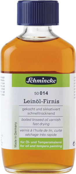 Gekocht, sikkativiert, Leinöl mit öl-löslichen Trockenstoffen verkocht. Als Bindemittelkomponente für Malmittel und zum Selbstanreiben von Ölfarben. Trocknet schneller als gebleichtes, kalt geschlagenes Leinöl.