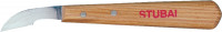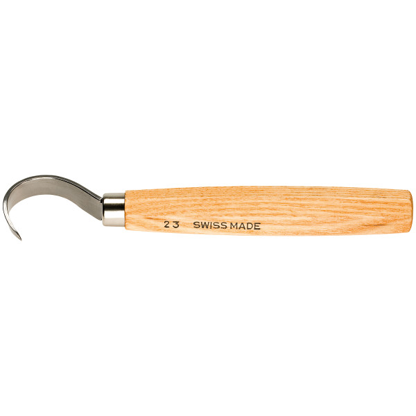 Handliche Löffelmesser mit geschweifter Klinge für die Ausarbeitung von Hohlkörpern. Geölter Eschenholzgriff. Gesamtlänge 150 mm.