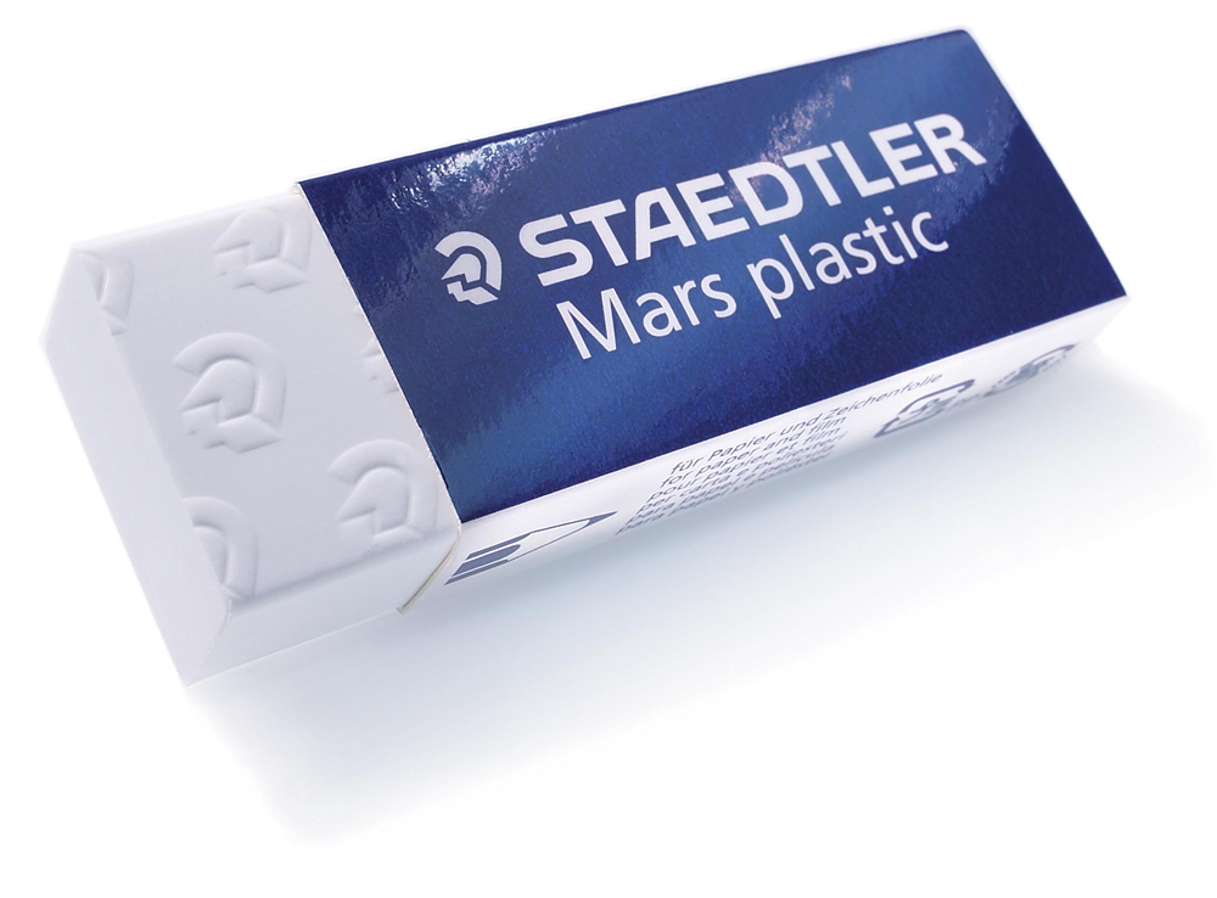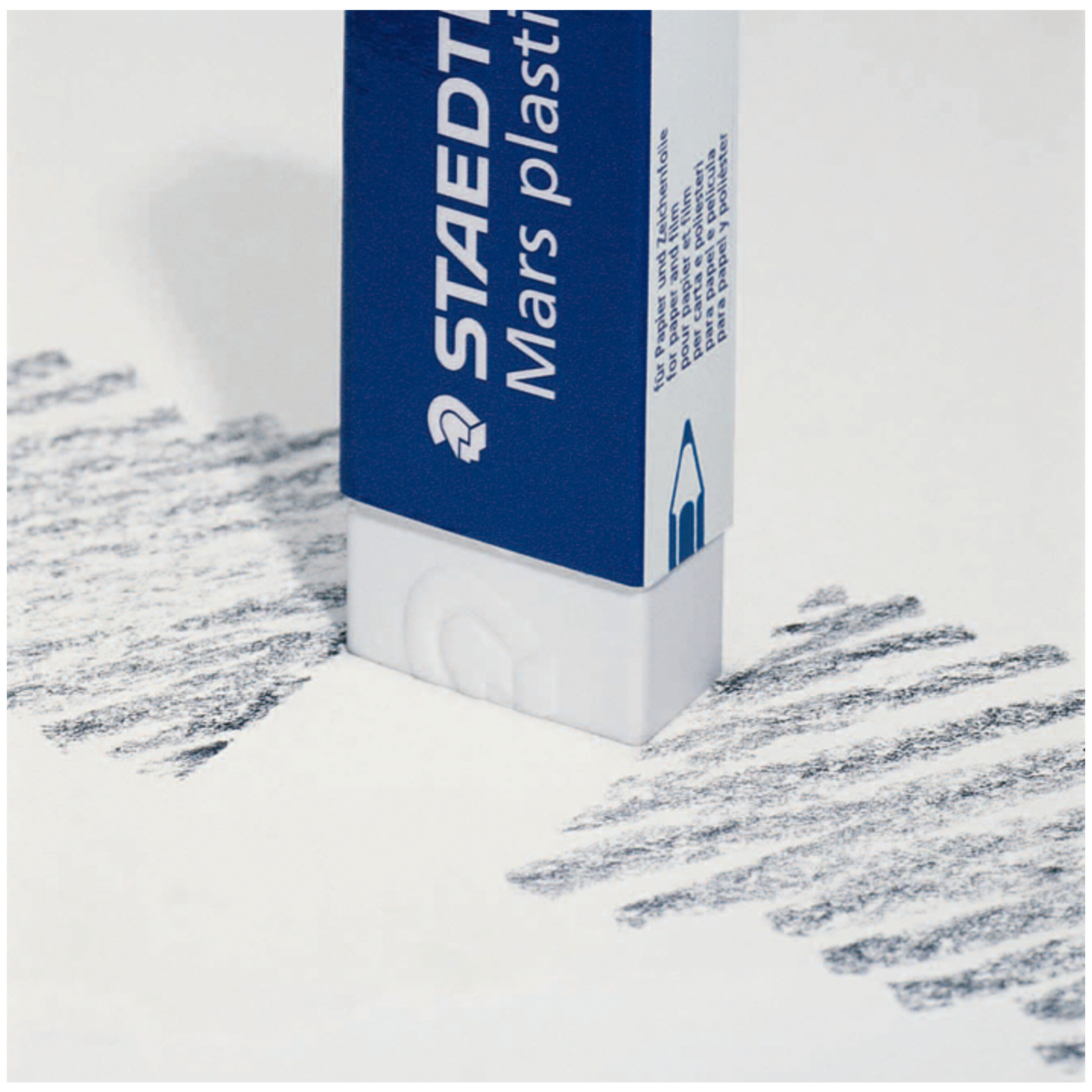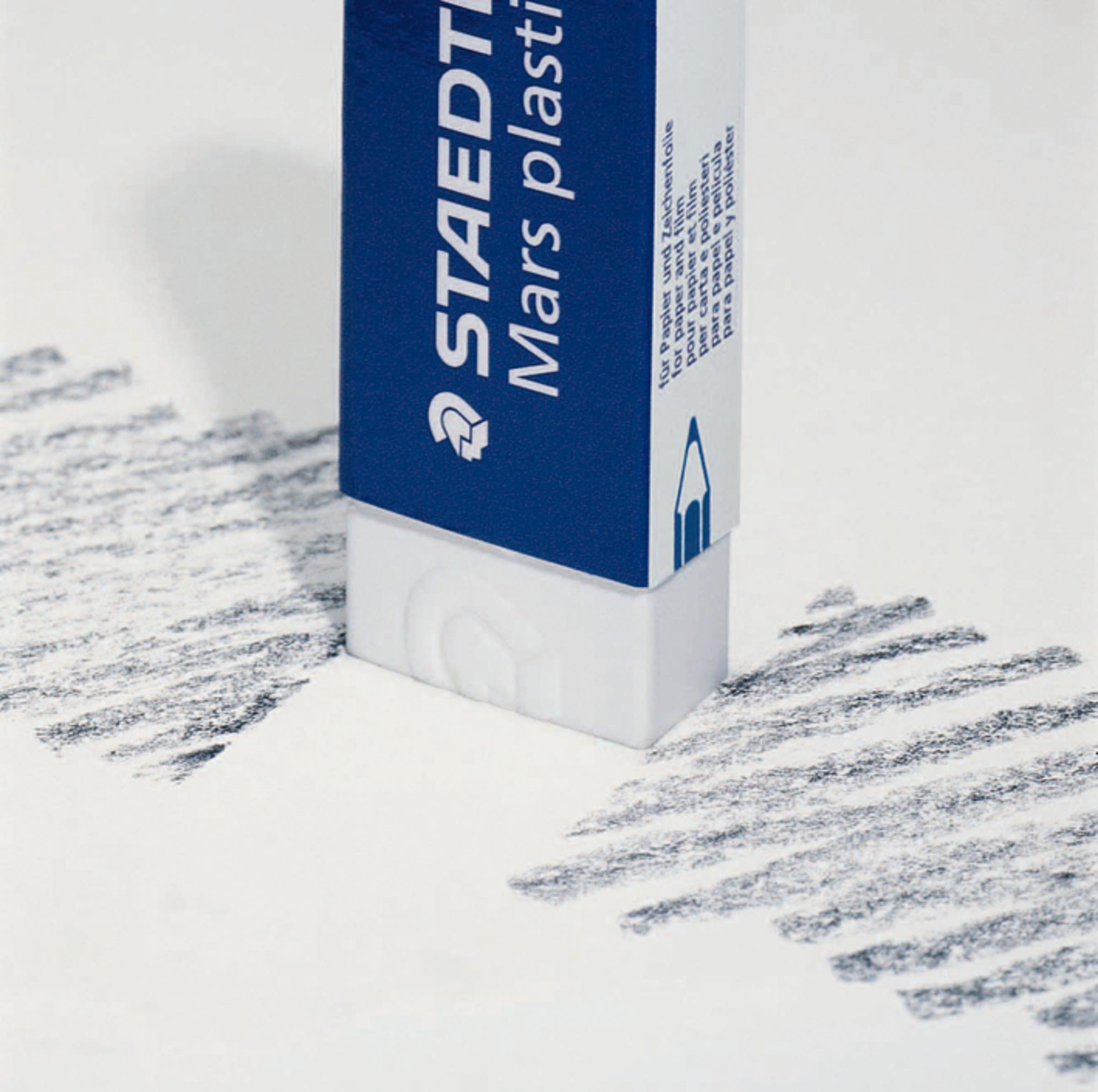 Weißer Kunststoff-Zeichenradierer in Premiumqualität. Radiert ohne zu schmieren. Für Grafit auf Papier und mattierter Zeichenfolie und für Folienstiftabstriche auf Overheadfolie. Nahezu rückstandfreies Radierergebnis, leichtes Entfernen der Radierüberreste durch sehr geringe Krümelbildung, mit Schiebe-Manschette für komfortables Handling. Phthalat- und latexfrei. Absolut alterungsbeständig. Größe: ca. 65 x 23 x 13 mm.