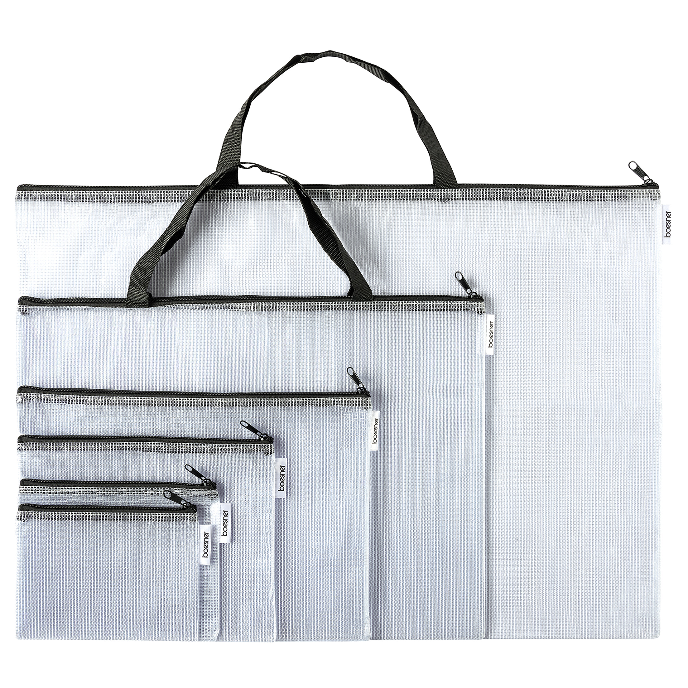Praktische Transport- und Aufbewahrungstasche aus transparenter, mit Netzgewebe verstärkter PVC-Folie. In der wasserfesten Tasche mit Reißverschluss lassen sich Utensilien, Zeichnungen, Bilder, Pläne etc. sichtbar, griffbereit und gut geschützt verstauen.