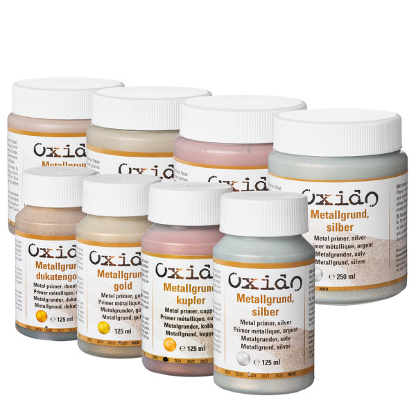 Die acrylbasierte Dispersion enthält feines, pulverförmiges Edelmetall. In Anwendung mit den Oxido Oxidationsmedien entstehen unterschiedliche authentische Patinaeffekte. Da die Anhaftung dieser Spezialdispersion nicht auf allen Flächen gleich gut erfolgt, sollten glatte Untergründe (Glas, Metall, Kunststoff) vorher mit boesner Universal-Haftprimer vorbehandelt werden. Metallgrund kann auch als Metalldispersion zum Aufstreichen auf Karton, Holz, Wachs (Kerzen), Styropor®, Gips- und Wandflächen verwendet werden. Erhältlich in vier Farbvarianten, jeweils in 125 ml- und 250 ml-Dosen.
