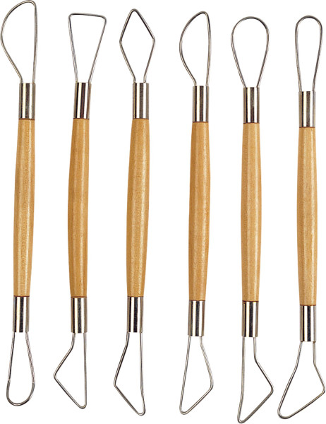 Das Set beinhaltet 6 verschiedene, doppelendige Tonwerkzeuge mit 12 runden Bandstahlschlingen. Mit Hartholzheften. Länge 20 cm. Gute Qualität. Sehr günstiges Angebot.