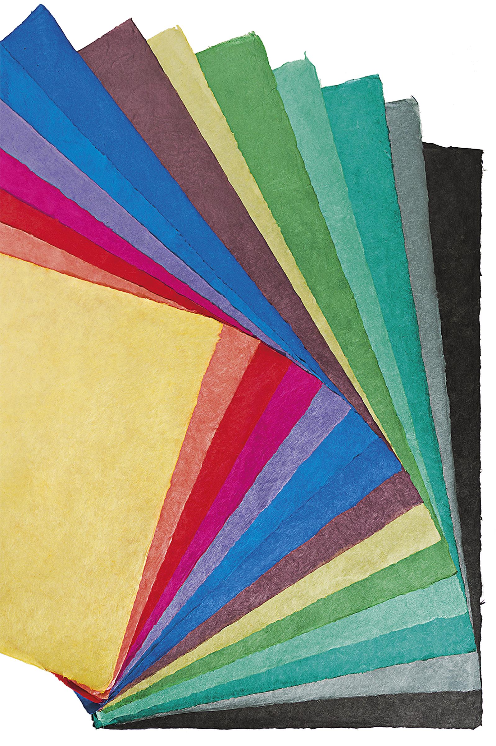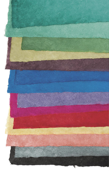 Aus 100 % Seidelbast (Lokta), säurefrei. 4-seitiger Büttenrand, Bogen für Bogen ist in Handarbeit einzeln aus der Bütte geschöpft. Die Einfärbung des Papiers erfolgt mit synthetischen Farbstoffen und ist somit lichtbeständiger als die Verwendung von Naturfarben.