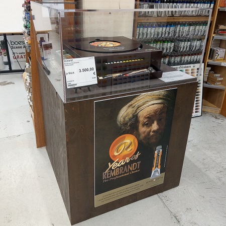 Diese steht ganz im Zeichen des Künstlers und der Farbmarke Rembrandt. Der hochwertige Malkasten um € 3.500,- enthält alle 120 Ölfarben sowie zahlreiche Hilfsmittel für die Ölmalerei, wie Pinsel oder Malmesser.
