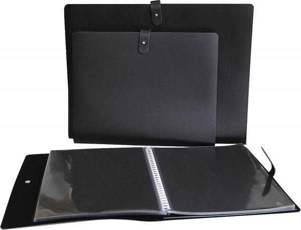 Hohe Funktionalität und elegantes Design in Perfektion bietet dieses flexible, schwarze Album mit Spirale zum Öffnen. Der aus schwarzem, wiederaufgearbeitetem Leder gefertigte Einband hat eine praktische Verschlusslasche und eine...