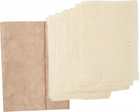 Das Komplettset enthält alles, was zur Papierherstellung benötigt wird: einen zweiteiligen Schöpfrahmen aus Holz, zwei Gautschfilzmatten, Zellstoffplatten und eine Schöpfanleitung.