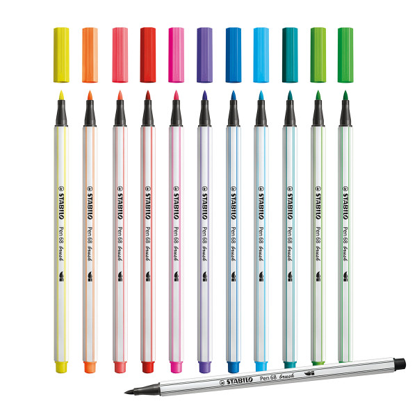 Der Pen 68 Brush mit flexibler Pinselspitze ist ideal zum Ausmalen, Hervorheben, Unterstreichen und Schattieren oder z. B. für Techniken wie Brush-Lettering oder Color-Blending geeignet. Dank der wasserbasierten Tinte lassen sich mit Pinsel und etwas Wasser auch Aquarell-Effekte erzielen. Erhältlich ist der Brush-Pen für vielseitige Linien-Variationen in 24 brillanten Farben inkl. 5 leuchtender Neon-Farben, die dank identischer Farbtinte perfekt zu den Pen 68-Standardfarben passen.