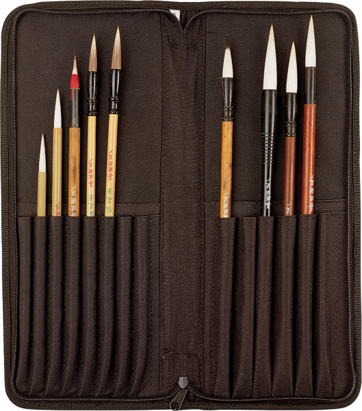 Solide verarbeitete aufklappbare Pinselmappe aus schwarzem Textilgewebe. 14 schmale und breitere Fächer und zwei Innentaschen bieten viel Platz für Pinsel oder anderes Mal- und Zeichenzubehör. Größe aufgeklappt: 33 x 37,3 cm. Wird über einen umlaufenden Reißverschluss geschlossen. Ohne Inhalt.