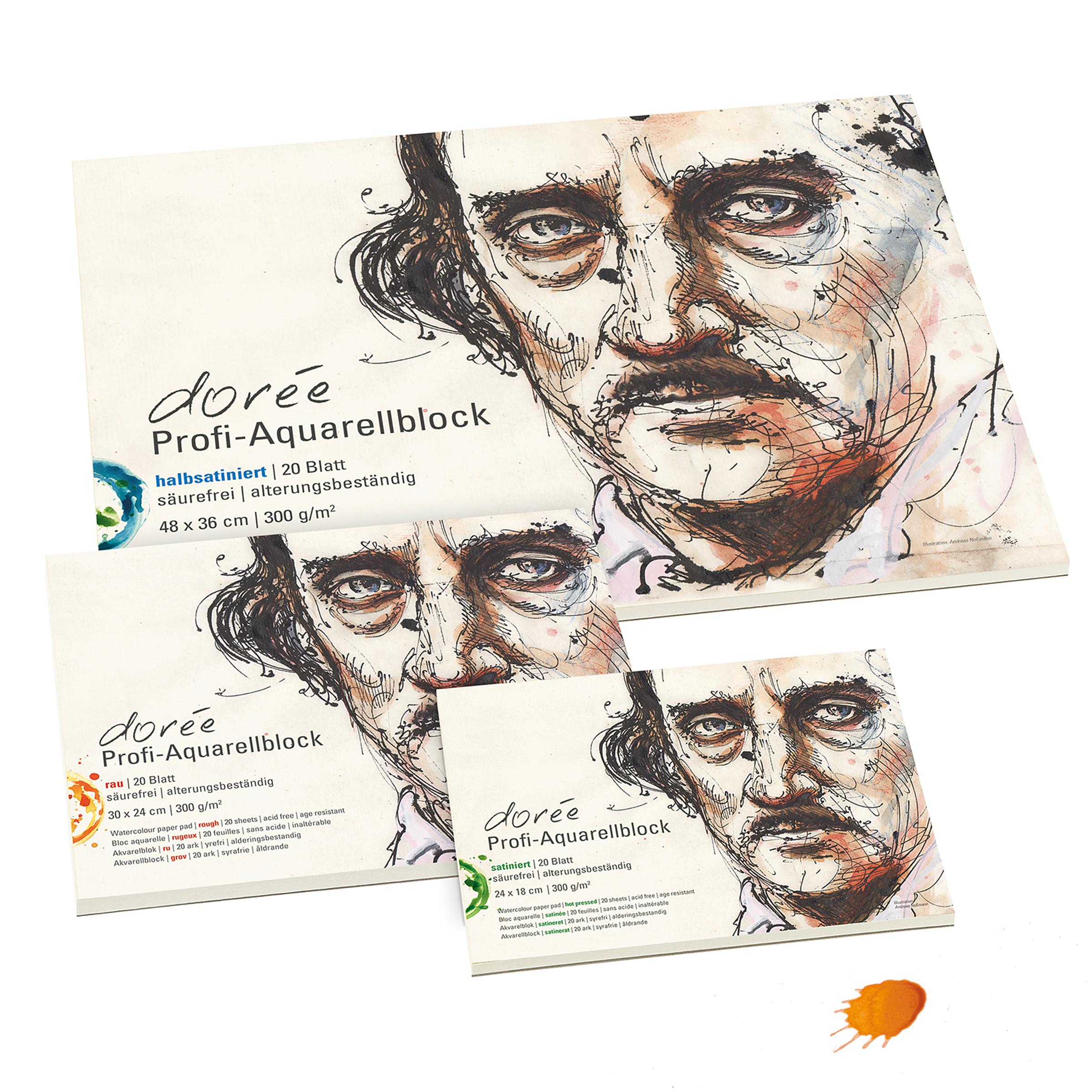 Das säurefreie, alterungsbeständige, naturweiße Papier in professioneller Künstlerqualität besteht zu 100 % aus Hadern (Baumwolle) und weist dadurch eine besonders hohe Absorptionskapazität auf. Es enthält keine optischen Aufheller, ist rundum verleimt und überzeugt durch eine gute Planlage, auch im nassen Zustand. Die Papiere sind mit einer Oberflächenleimung auf Basis natürlicher Gelatine versehen, welche aufgetragene Farbpigmente noch intensiver leuchten lässt. Die satinierte Papiervariante mit seiner glatten Textur eignet sich hervorragend für detailreiche und präzise Aquarellzeichnungen sowie für alle anderen Nass- und Trockentechniken. Die satinierte Oberfläche lässt auch das Radieren bzw. Korrigieren problemlos zu. In der halbsatinierten Ausführung ist das Aquarellpapier mit einer nahezu glatten Struktur versehen, die ebenfalls ein Abwischen oder Ausbessern des Farbauftrages erlaubt. Beide Papiervarianten sind auch hervorragend für aquarellierbare Tintenstifte (z. B. Derwent Inktense) geeignet. Die raue Papierversion, die besonders von Landschaftsmalern geschätzt wird, zeigt eine stark unregelmäßige Oberfläche, deren Struktur an Wolken erinnert. Sie bietet nicht nur eine gute Grundlage für Aquarellfarben, sondern auch für Farbstifte auf Ölbasis (z. B. Derwent Lightfast).