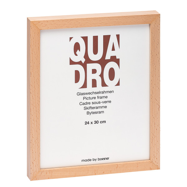 Glaswechselrahmen der Serie Quadro werden gerne im Ausstellungs- und auch im Objektbereich verwendet. Der Einsatz von Massivleisten aus heimischen Hölzern zeigt im Ergebnis sehr solide, stabile und ästhetische Bilderrahmen mit einer hohen Wertigkeit. Alle Glaswechselrahmen der Serie Quadro werden in den boesner-Werkstätten nach hohem Qualitätsstandard gefertigt.