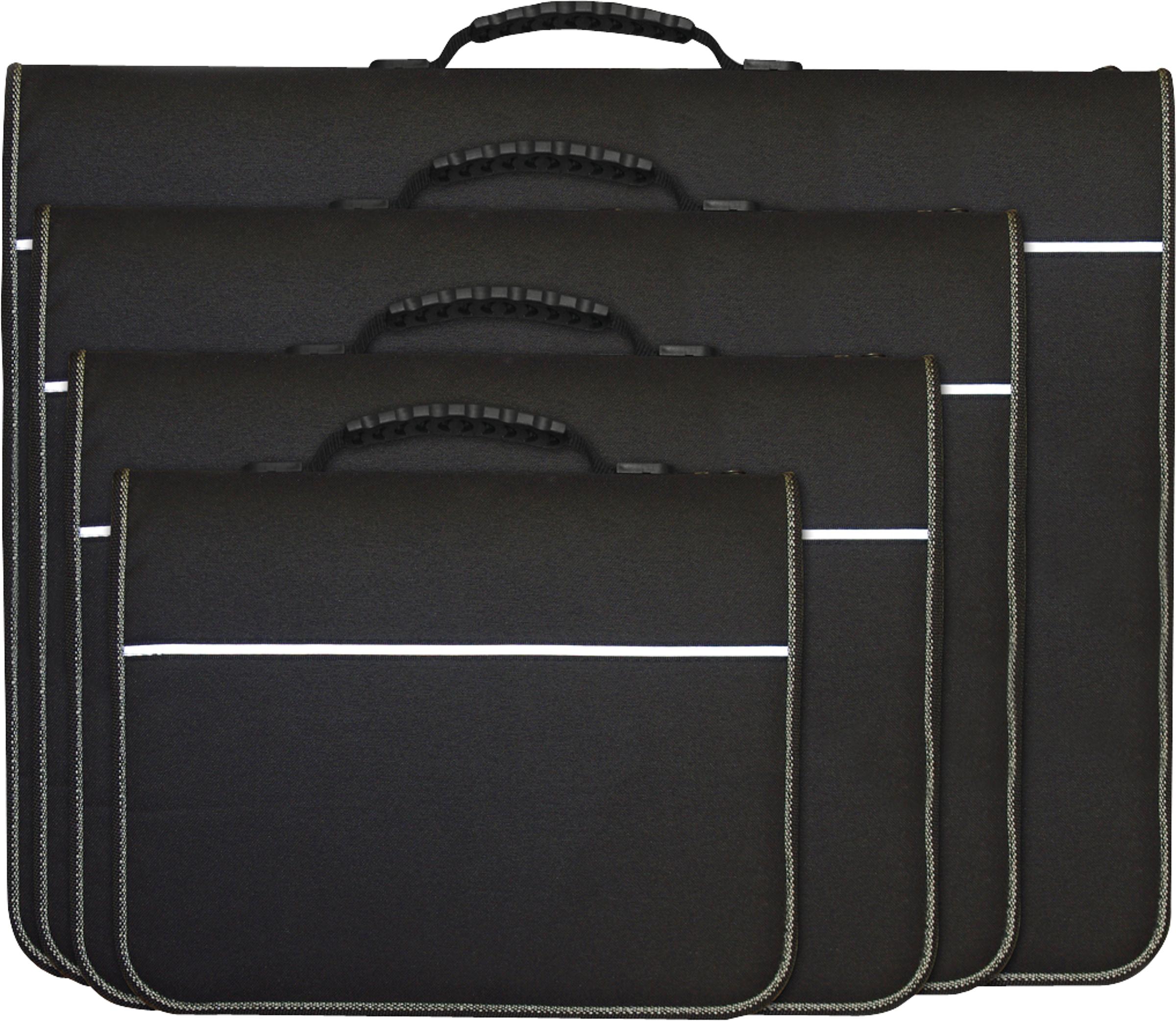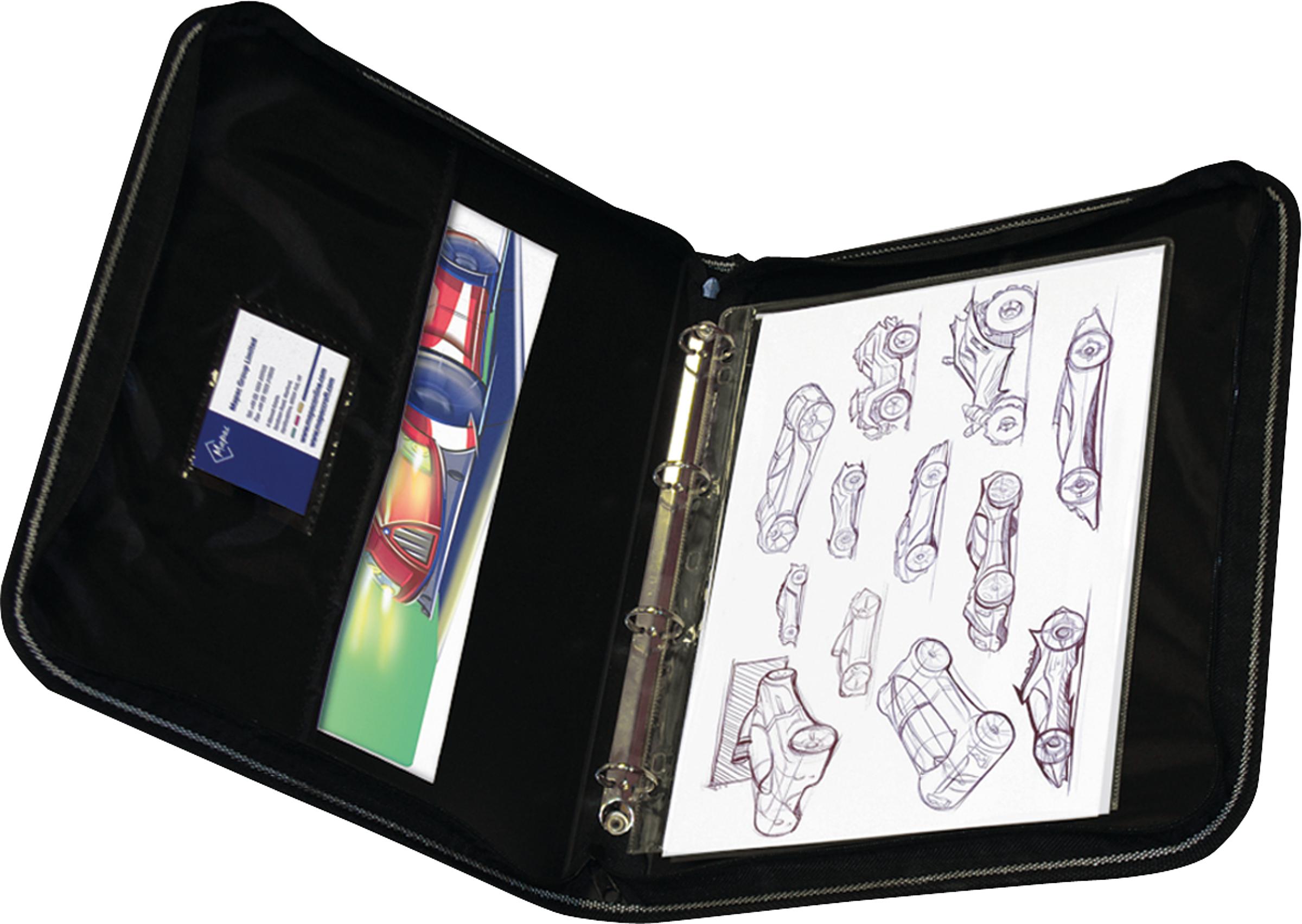 Aus schwarzem, gepolstertem, wasserabweisendem Nylongewebe; ringsherum verläuft ein silberfarbener, reflektierender Sicherheitsstreifen. Der stabile Ringmechanismus sorgt für einen sicheren Halt der Hüllen, zusätzliche Dokumente können in den zwei Innentaschen untergebracht werden. Die Mappe hat einen abgerundeten Tragegriff sowie einen verstellbaren Schultergurt.