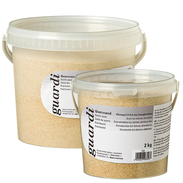 Zur Erzeugung feiner sandiger Strukturen. Der Quarzsand wird einfach mit Clavé-Medium (ohne Verdünnung mit Wasser) angeteigt und mittels Flächenspachtel oder Rakel dünn auf die Wand aufgetragen. Mit Guardi-Quarzsand können auch Spachtelmassen zur Herstellung reliefähnlicher Strukturen hergestellt werden. Körnung 0,2–0,6 mm, feuergetrocknet.
