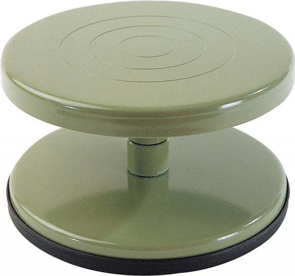 Grün lackiert, leichter Lauf. Mit umlaufender Gummierung an der Fußscheibe für rutschfesten Stand und Bohrung zur Befestigung am Tisch. Justierschraube zum Feststellen des Drehkranzes.
