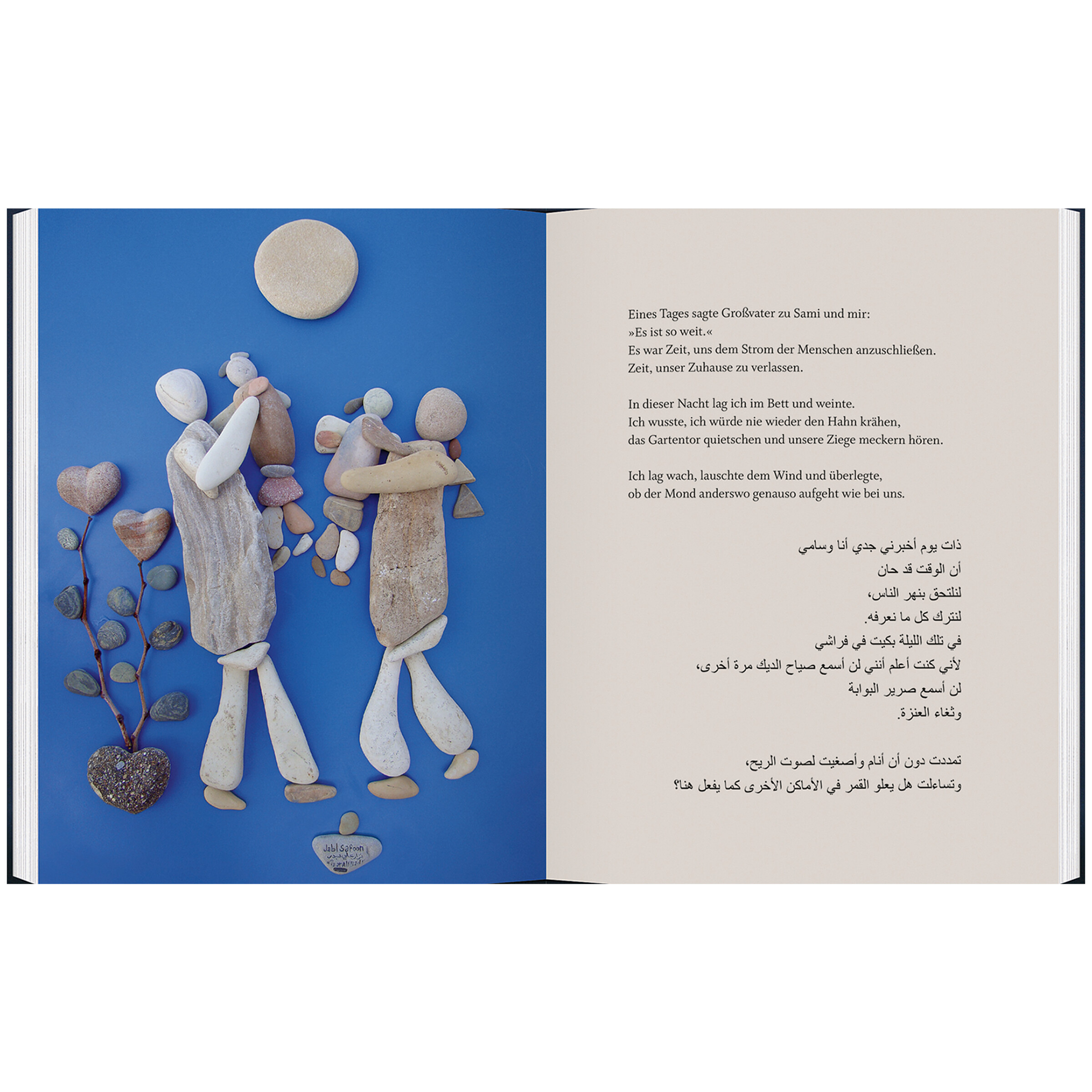 Ein ausdrucksstarkes, mit deutsch-arabischem Text versehenes Bilderbuch, dessen Bilder aus Steinen gelegt und fotografiert sind; es erzählt die Geschichte von Rama und ihrer Familie, eine Geschichte von Krieg, Flucht, aber auch Hoffnung.