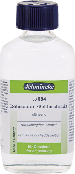 Glänzender Retuschier- und Schlussfirnis. Gilbungsfreier Kunstharzfirnis für Ölbilder und Kunstdrucke. Gut zum Herausholen eingeschlagener Bildstellen. Bildet einen dauerelastischen, sehr beständigen Film. Kann mit 20 % Terpentinersatz verdünnt werden für die Anwendung als Retuschierfirnis. Enthält Aldehydharz, Acrylharz, Testbenzin, Duftöle.