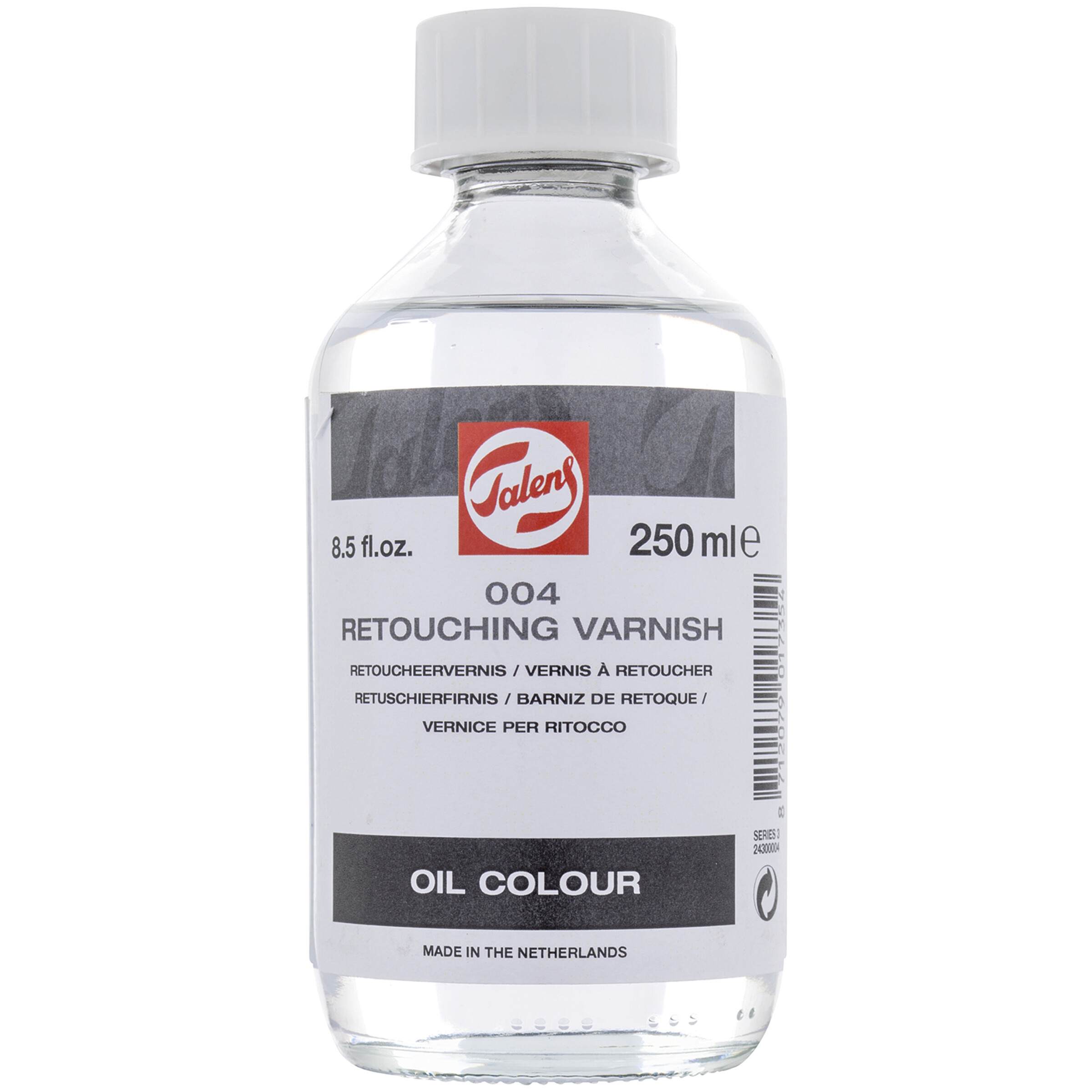 Vorläufiger Firnis, sobald die Farbe handtrocken ist (als vorläufige Schutzschicht zu verwenden). Auch zum Auffrischen von während des Malens glanzlos gewordenen Stellen. Der Firnis trocknet innerhalb weniger Stunden, ist sofort übermalbar, farblos, vergilbt nicht und gibt einen schwachen Glanz. Bei leichtem Firnissen (vorzugsweise mit einer Sprühdose) hat er keinen Einfluss auf den Trocknungsprozess. Er lässt sich mit milden Lösungsmitteln, wie z.B. Terpentinersatz, entfernen und ist mit Lackbenzin oder Terpentinöl verdünnbar. Enthält nicht vergilbendes, u.a. in Terpentinöl gelöstes, Kunstharz (Cyclohexanon).