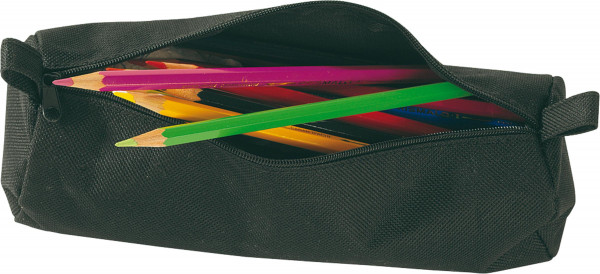 Aus schwarzem Textilgewebe, sorgfältig verarbeitet. Mit Reißverschluss. Großes Platzvolumen für Stifte und sonstige Zeichenutensilien. Länge ca. 22 cm, Durchmesser 7 cm. Ohne Inhalt.