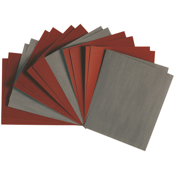Schleifpapier mit Aluminiumoxid- (Korn 60–120) bzw. Siliciumkarbidbeschichtung (Korn 180–400) auf Kunstharz-Basis. Ideal für Fein- bis Feinstschliff, zum Reinigen, Schleifen, Polieren und Glätten von Metallflächen, Speckstein oder Alabaster.