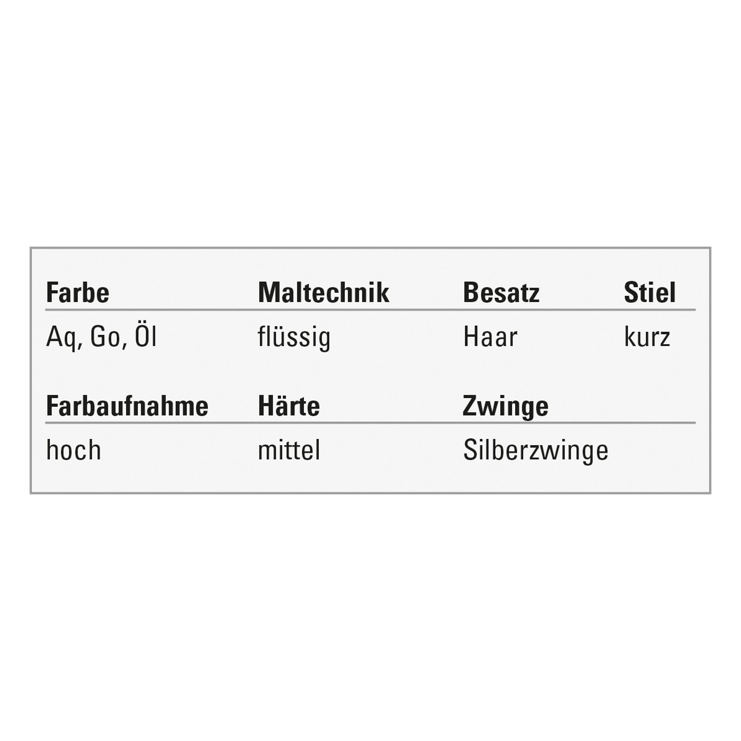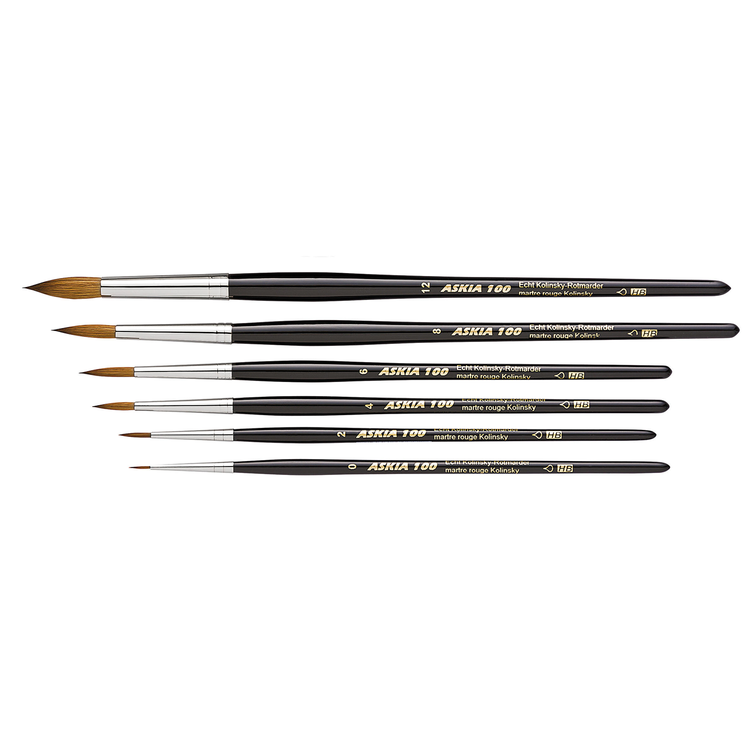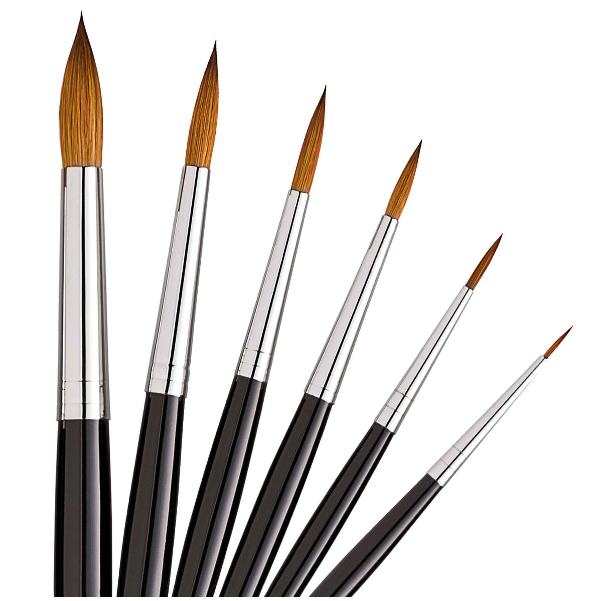 Rundpinsel mit echtem Kolinsky-Rotmarderhaar mit nahtloser Silberzwinge und kurzem, Schwarz lackiertem Stiel. Das Set beinhaltet die Größen 0, 2, 4, 6, 8 und 12. Made in Germany.