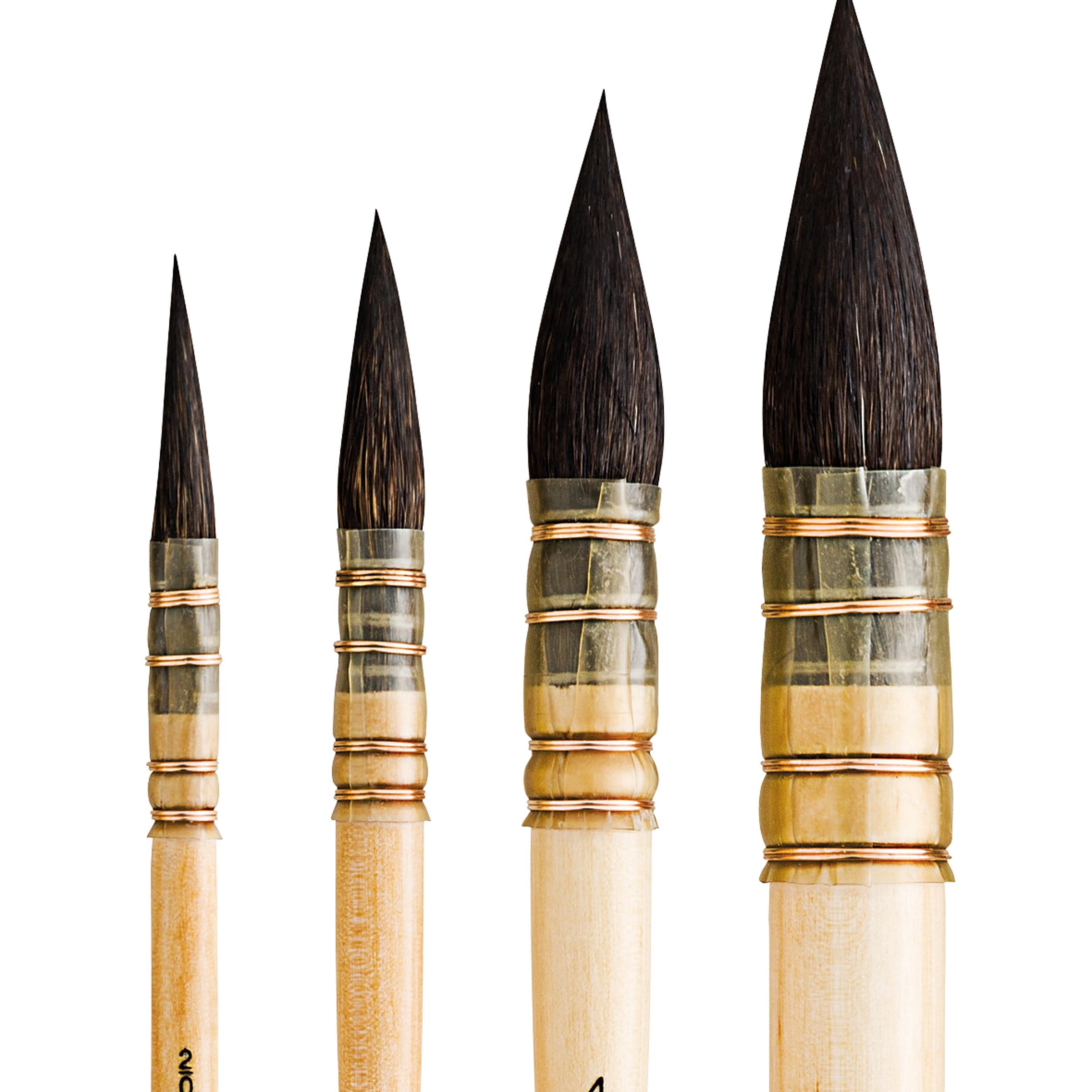 Besonders für das Verwaschen und Lavieren geeigneter Pinsel mit reinem, blauen russischen Fehhaar, in Naturkiel gefasst, mit einem kurzen, transparent lackierten Holzstiel. Von speziell dafür ausgebildeten Pinselmachern komplett in Handarbeit gefertigt. Made in Germany.
