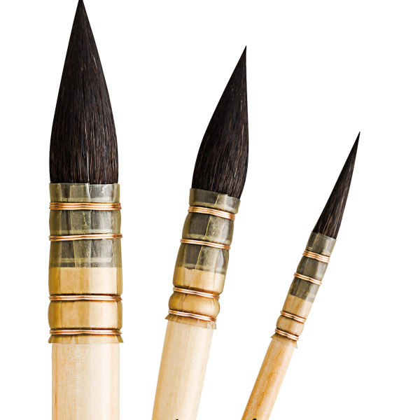 Besonders für das Verwaschen und Lavieren geeignet. Reines blaues, russisches Fehhaar, in Naturkiel gefasst, mit einem kurzen, lackierten Holzstiel. In Handarbeit gefertigt. Das Set beinhaltet folgende Größen: 2/0 (6)*, 4 (11)* und 8 (16)*.