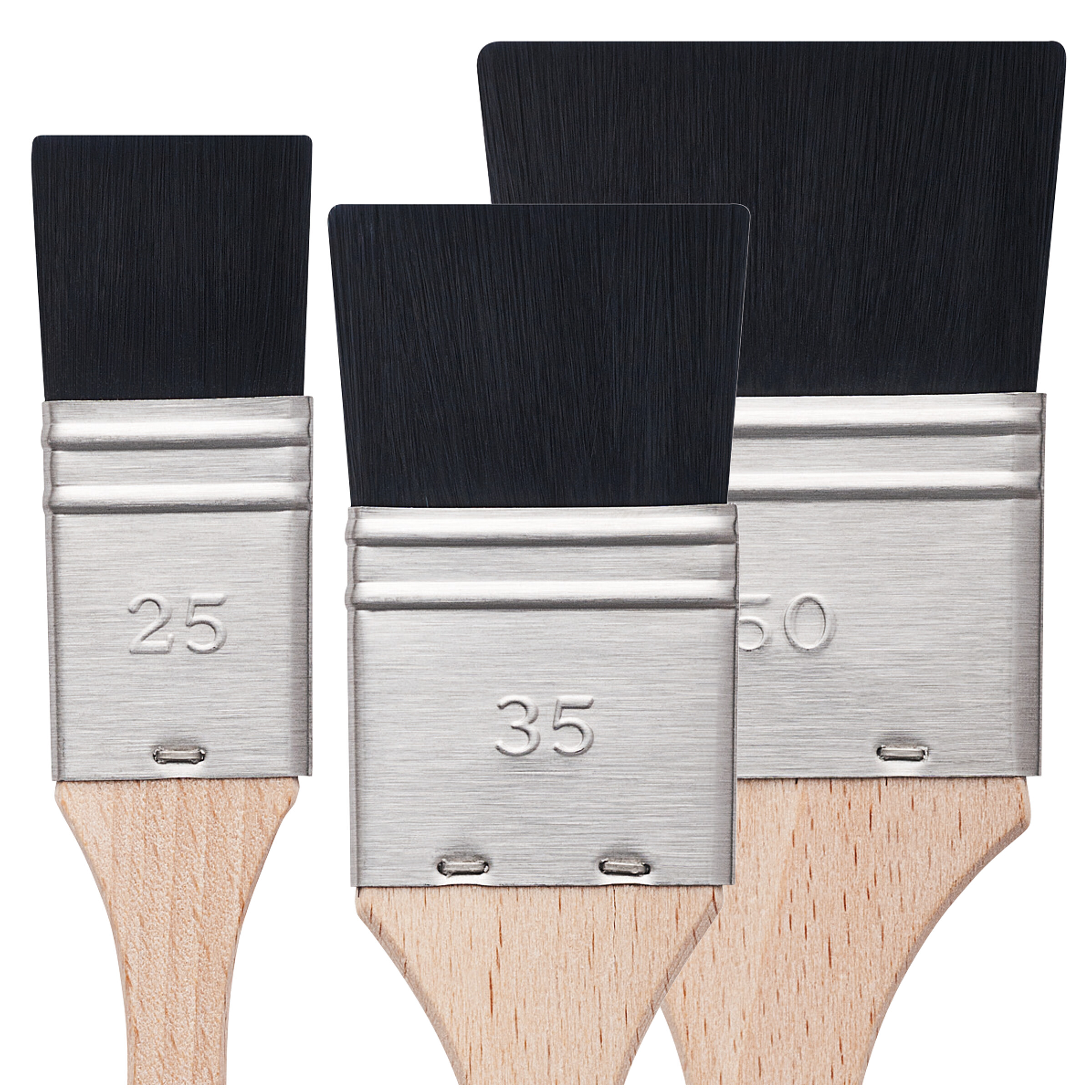 Breitpinsel mit extrem feiner, schwarzer Synthetikfaser sind ein hervorragender Ersatz für Naturhaar-Breitpinsel aus Ziegen- oder Fehhaar. Die feinen Synthetikhaare sind sehr reißfest und dadurch sowohl für flüssige als auch pastose Farben verwendbar. Besonders gut eignen sie sich auch für das Aufbringen von Lasuren und Firnis. Gefasst sind die Haare in eine rostfreie Edelstahlzwinge. Der kurze Stiel besteht aus naturbelassenem Buchenholz mit Loch zum Aufhängen. Made in Germany.