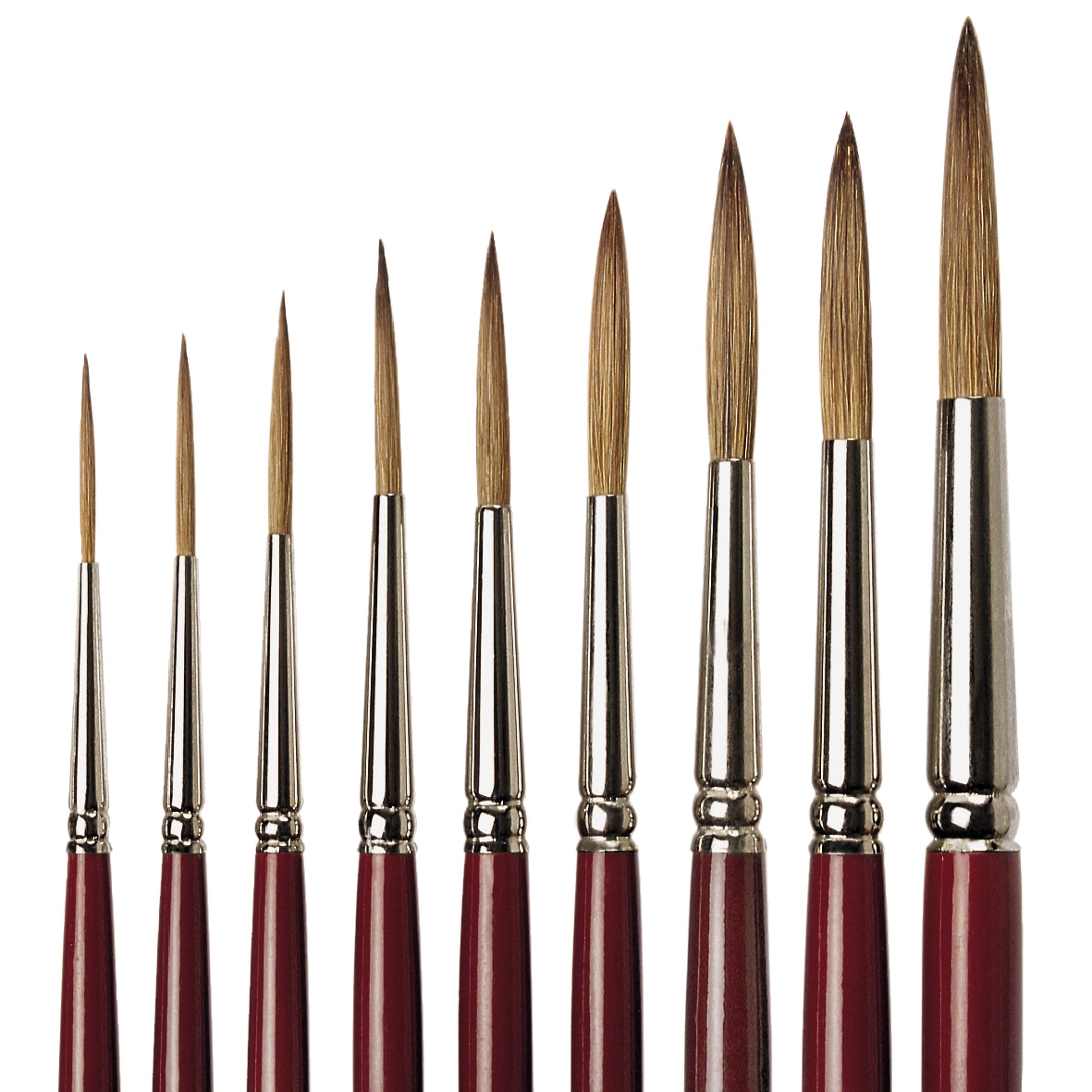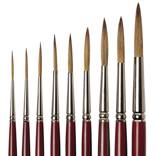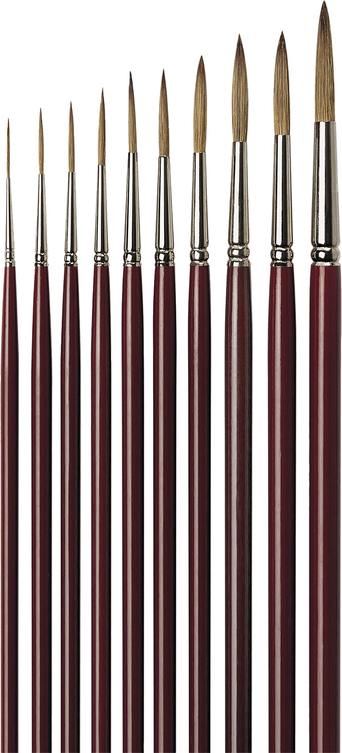 Hochwertiger Schlepper. Rundpinsel mit echtem Kolinsky-Rotmarderhaar. Langer, kirschroter Stiel, nahtlose Silberzwinge. Die ausgezeichnete Qualität des Besatzes sorgt für hohe Speicherkapazität, und die exakt ausgeformte Haarspitze eignet sich hervorragend für lange, präzise Striche und Detailarbeiten. Ab Größe 14 wird das Rotmarderhaar verstärkt, um die Standfestigkeit zu erhöhen. Made in Germany.