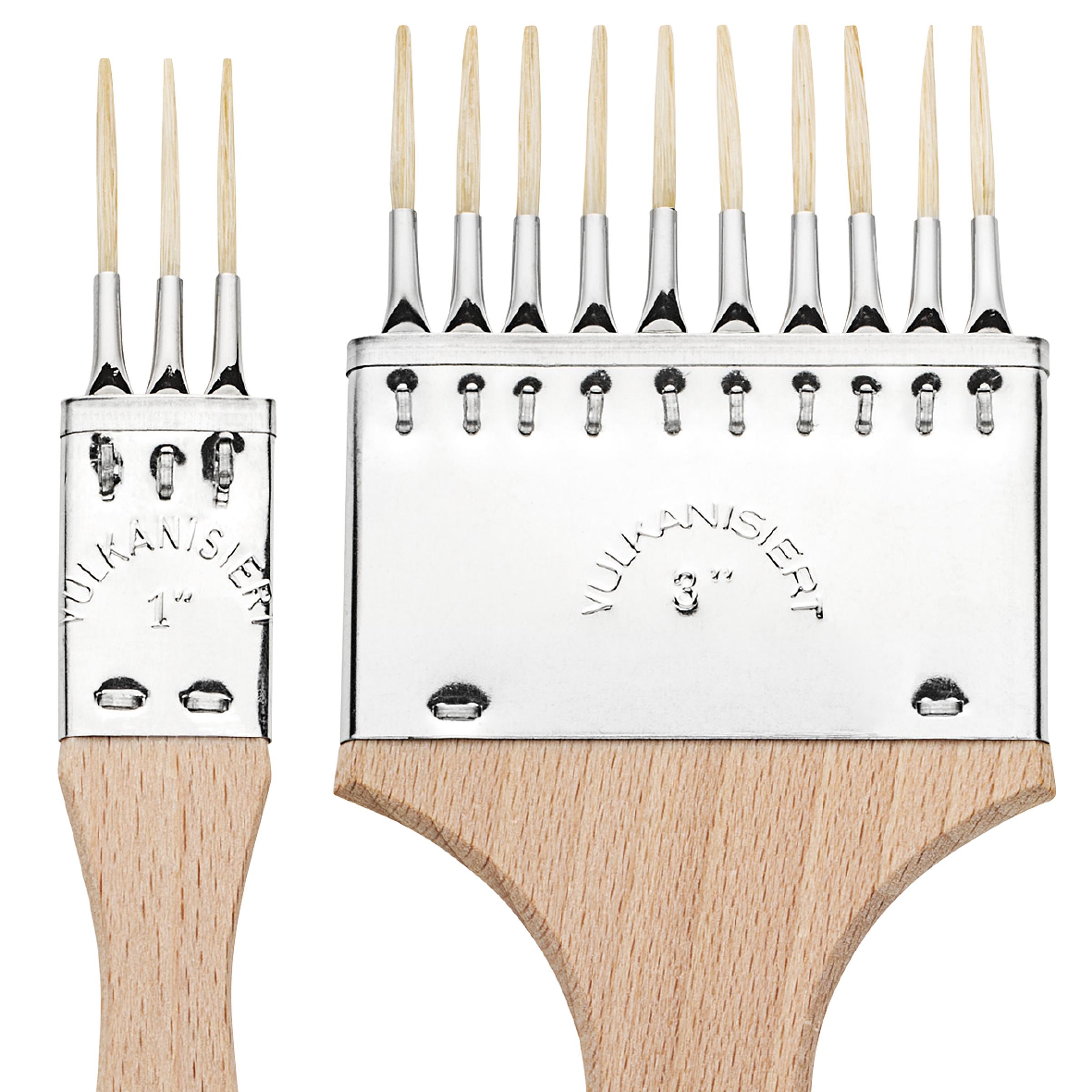 Helle Borsten sind in runden, kleinen Zwingen getrennt voneinander gefasst. Kurzer Rohholzstiel. Mit dem Spezialpinsel für Öl-/Acrylfarben lassen sich u.a. parallele Linien ziehen. Made in Germany.