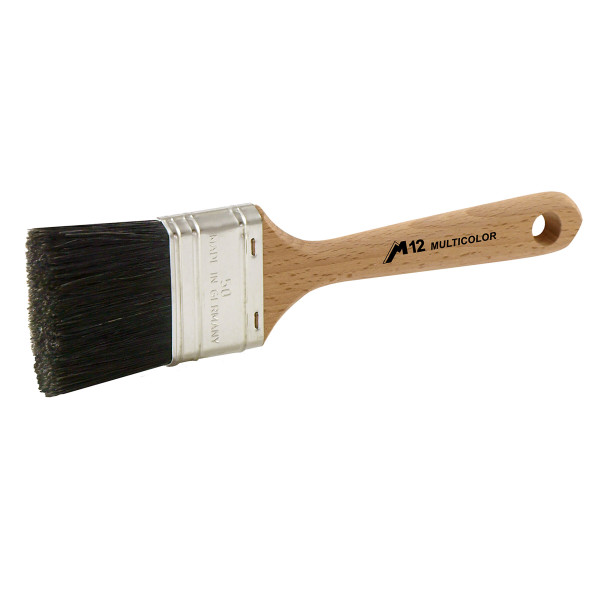 Flachpinsel mit schwarzer vollsynthetischer Mischung, Weißblechzwinge, 6. Stärke, kurzer Buchenholzstiel.