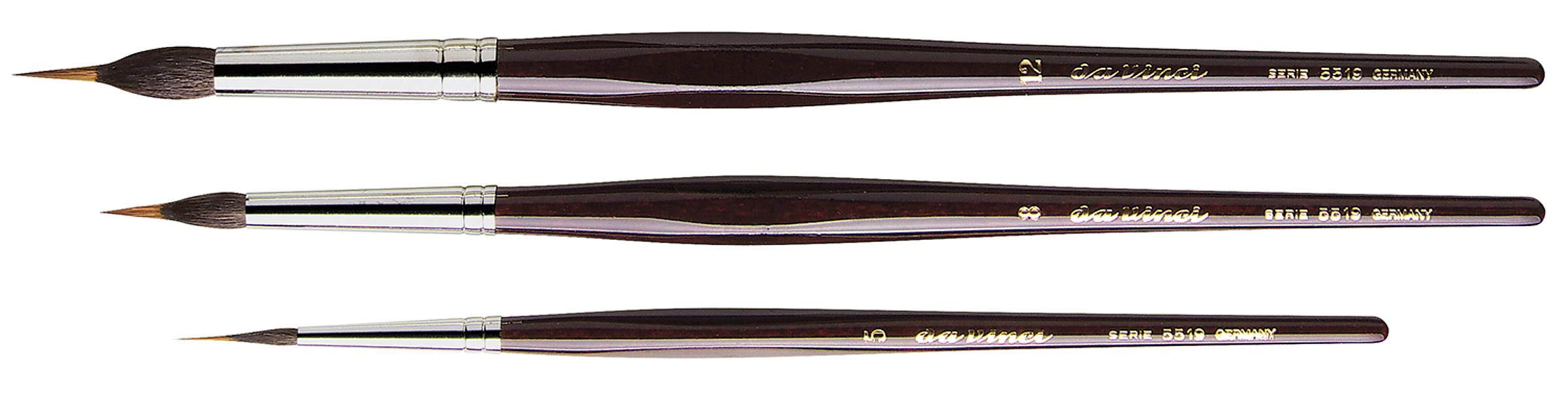 Spezialpinsel mit abgesetzter, extra langer und nadelfein gebundener Kolinsky-Rotmarder-Spitze. Der Pinselkörper aus Kasaner Fehhaar ist als Farbspeicher ausgebildet. Kurzer, bordeauxfarbener Esagonalstiel mit Silberzwinge. Made in Germany.