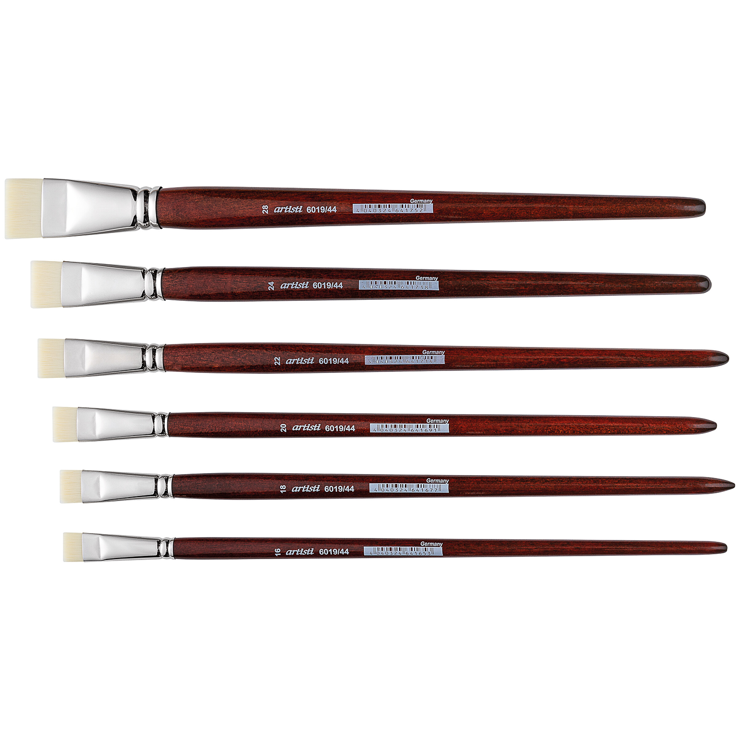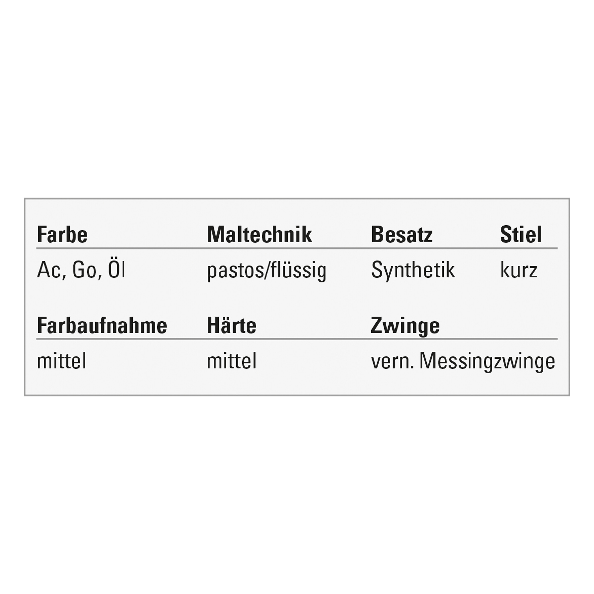 Hochwertiger, extra kurz gearbeiteter Acrylmalpinsel aus besonders feinen Synthetikfasern, die einen kurzen, sehr kräftigen Haarverbund bilden. Damit lässt sich auch pastose Acrylmalfarbe hervorragend verarbeiten. Durch die feinen Haarspitzen und die stabilen Fasern sind die Pinsel sehr formbeständig und eignen sich perfekt für exakte Arbeiten. Ausführung mit nahtlosen, vernickelten Messingzwingen. Langer Stiel aus lackiertem, FSC-zertifiziertem Birkenholz. Made in Germany.