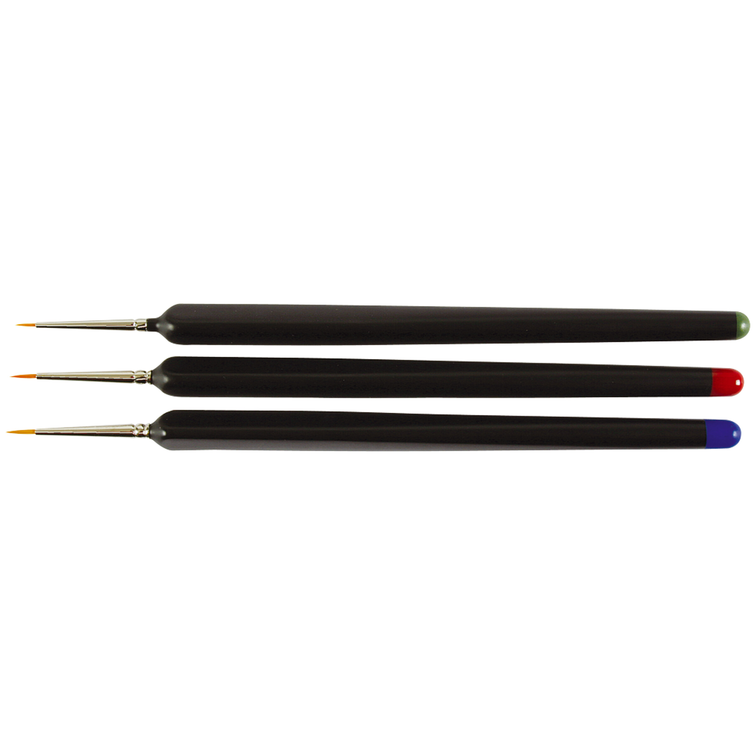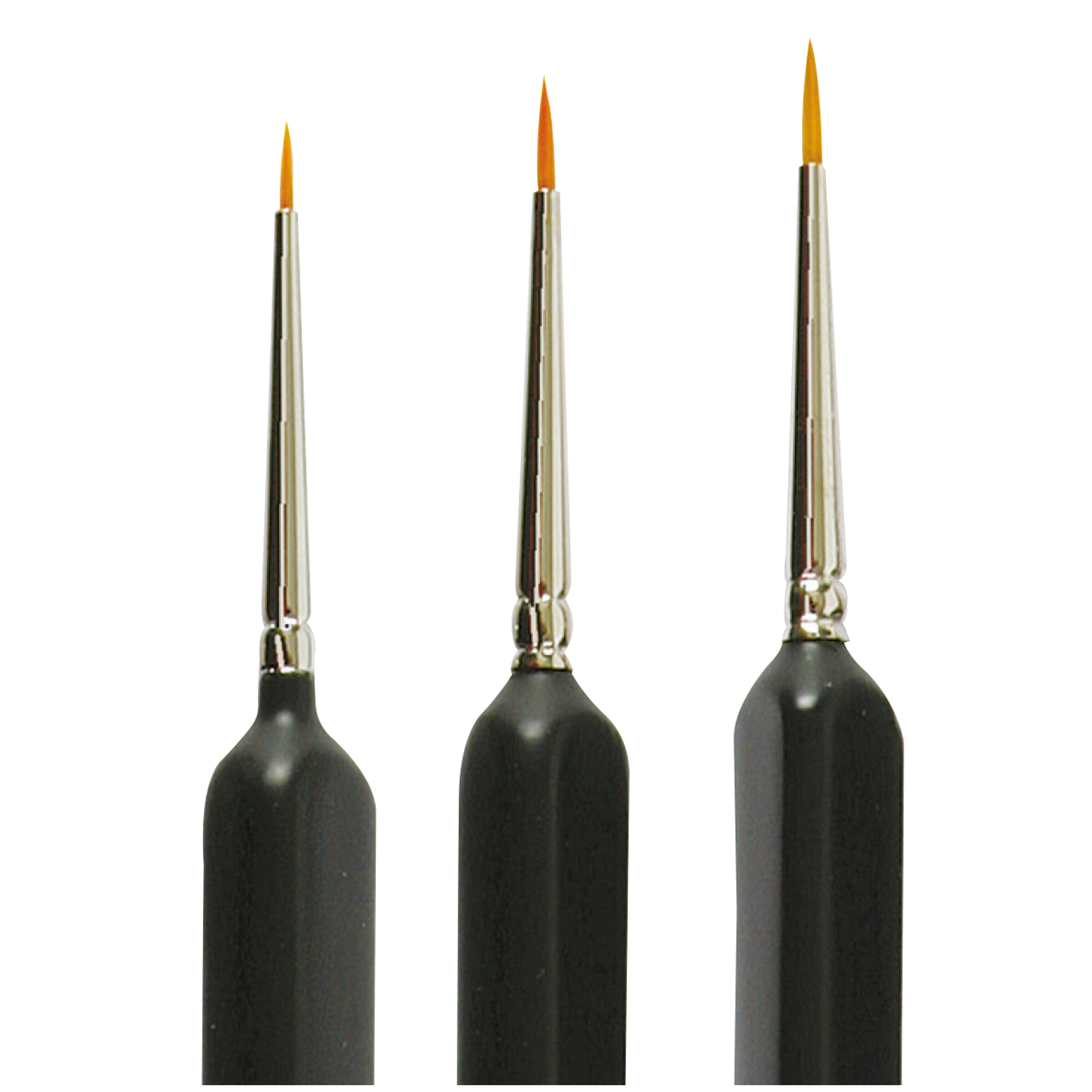 Feine Rundpinsel mit Synthetik-Besatz für Miniaturen, Detailarbeiten und Modellbau. Der ergonomisch dreieckig geformte, kurze Holzstiel ermöglicht eine sehr sichere Pinselführung. Für Acryl, Öl, Gouache und Plaka. Das Set beinhaltet folgende Größen: 3/0, 2/0, 0. Made in Germany.