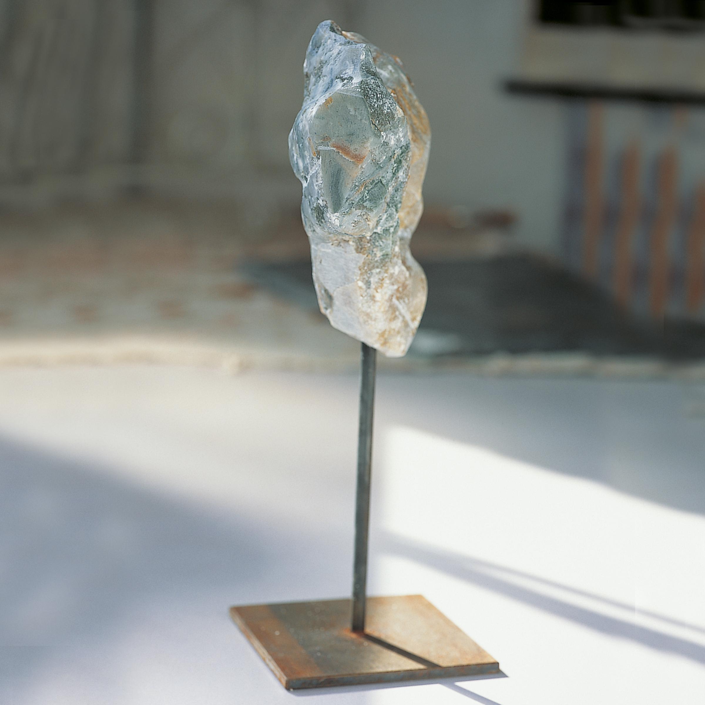 Von Hand gefertigter Skulpturenständer aus massivem Eisen DC01 mit rutschfester Filzunterlage. Die unbehandelten Oberflächen der Sockelplatte und des Stabes lassen das Metall mit der Zeit korrodieren. Es entsteht eine reizvolle Patina, die den Skulpturenständer zum Unikat macht. Für den Einsatz im Künstleratelier, als Objektträger in Ausstellungen, aber auch jenseits aller Zweckgebundenheit ungemein kultig. Deutsche Qualität. (Skulpturenständer ohne Dekoration erhältlich.)