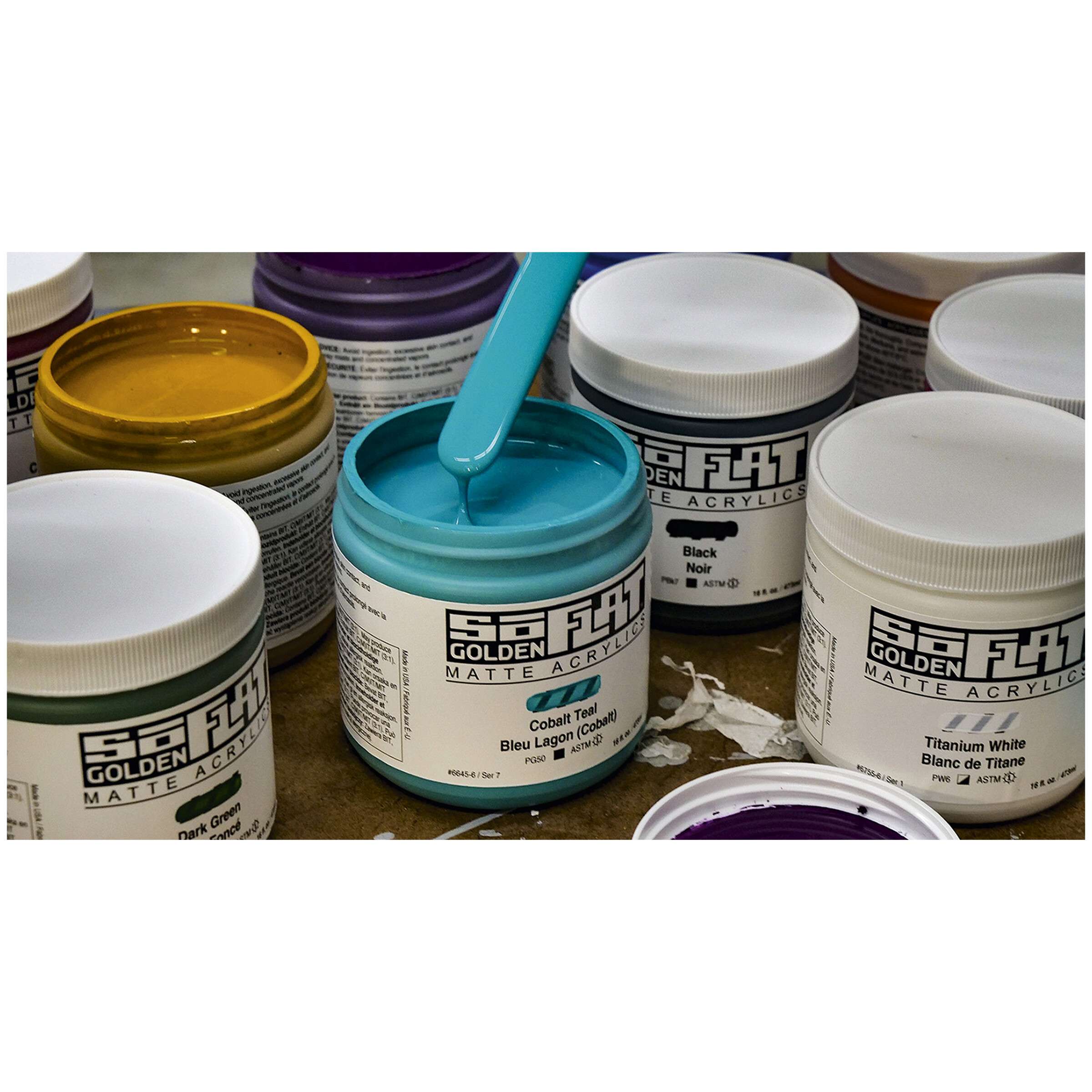 Die selbstnivellierende Profi-Acrylfarbe aus der Golden-Serie trocknet vollkommen matt und blendfrei auf. Ihre flüssige Konsistenz sorgt für einen optimalen Verlauf, der nahezu keine Pinselspuren hinterlässt. So Flat weist einen hohen Pigmentgehalt sowie optimale Deckkraft auf und wurde speziell entwickelt, um in nur wenigen Schichten einheitliche Flächen mit satten, leuchtenden, matten Farben zu erzielen. Ideal für Illustrationen, Grafikdesign, Street Art u. v. m. Durch das matte Erscheinungsbild ohne Reflexionen lassen sich mit So Flat erstellte Werke besonders gut abfotografieren und kommen auch online ideal zur Geltung. Die beständigen, flexiblen Farben sind kompatibel mit anderen Farben und Medien aus der Golden-Serie.