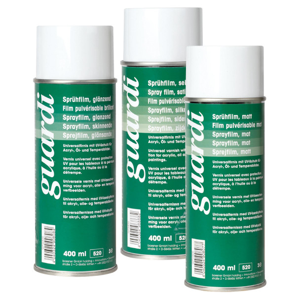 Schnell trocknender, elastischer, nicht gilbender und alterungsbeständiger Universalfirnis mit integriertem UV-Schutz für Acryl-, Öl- und Temperabilder. Der Sprühfilm ist sehr wasserabstoßend, benzinfest, stoß- und kratzfest, haftet gut, ist völlig transparent und härtet sehr gut aus.