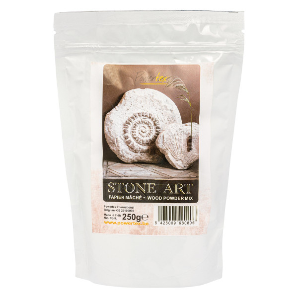 Powertex Stone Art ist ein pulverförmiger Zellulosestoff, der mit Powertex Dekorationsverhärter gemischt eine Modelliermasse ergibt.