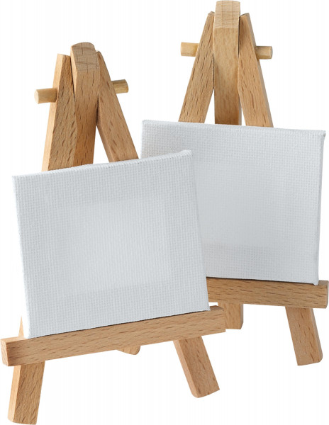 Dieses Set besteht aus zwei kleinen Buche-Staffeleien und zwei kleinen Keilrahmen (5 x 6 cm), verwendbar z. B. als Tischkartenständer oder für kleine Malereien. Höhe der Staffelei: 12 cm.
